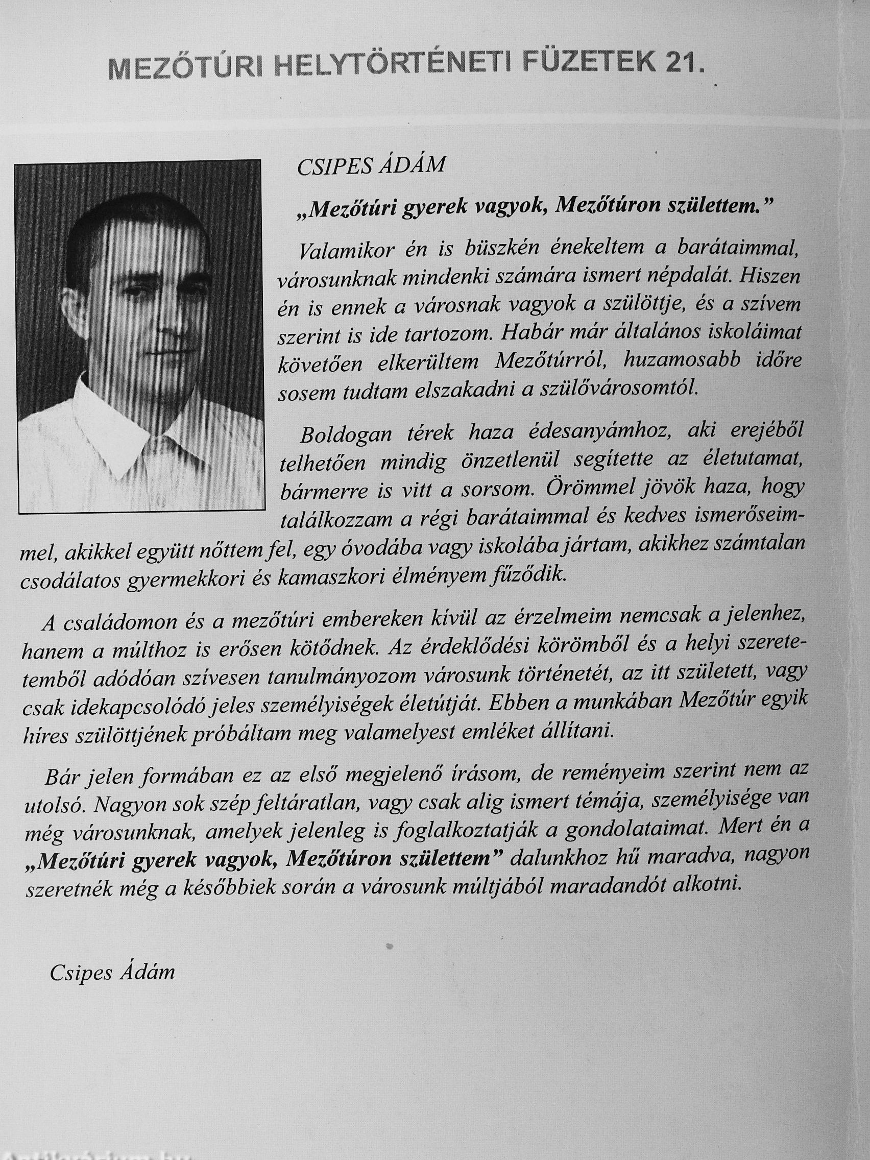 Bár jelen formában ez az első megjelenő írásom, de reményeim szerint nem az utolsó. Nagyon sok szép feltáratlan, vagy csak alig ismert témája, személyisége van még városimknak, amelyek jelenleg is foglalkoztatják a gondolataimat. Mert én a „Mezőtúri gyerek vagyok, Mezőtúron születtem" dalunkhoz hű maradva, nagyon szeretnék még a későbbiek során a városunk múltjából maradandót alkotni.
