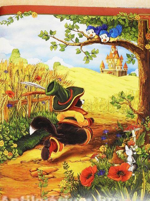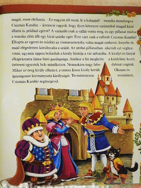"Egy kis faluban lakott a molnár három fiával. Öreg volt már és mielőtt meghalt volna, a fiaira íratta egész vagyonát. A legidősebb kapta a malmot, a középső a szamarat, a legfiatalabb, János pedig egy macskát. Szomorkodott a fiú, mikor megtudta mit örökölt apjától. Bátyjai örökségükkel megkereshetik mindennapi kenyerüket, ő viszont mit ér el egy macskával? - Ne aggódj gazdám. Adj nekem egy szép csizmát és meglátod, nagyurat faragok belőled - szólalt meg a macska és illedelmesen meghajolt a fiú előtt. Meglepődött János, és ezt hallván elnevette magát de mivel jobb ötlete neki sem volt, hát vett egy pár csizmát, kalapot és bőrövet az utolsó garasán. Ebben az öltözetben a macska igazán elegánsan nézett ki. János a vállára ültette Csizmás Kandúrt és elindult munkát keresni. Egyszer, mikor egy tó mellett jártak, a macska messziről meglátta a királyi hintót. Azonnal megparancsolta gazdájának, hogy vetkőzzön le és ugorjon bele a tóba." Vissza
