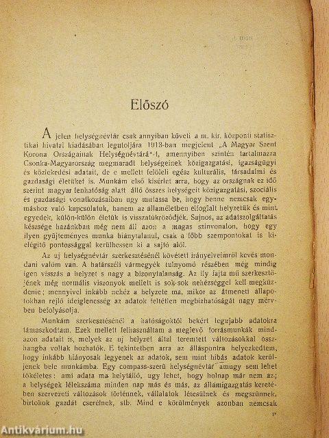 A jelen helységnévtár csak annyiban követi a m. kir. központi statisztikai hivatal kiadásában legutoljára 1913-ban megjelent "A Magyar Szent Korona Országainak Helységnévtárá"-t, amennyiben szintén tartalmazza Csonka-Magyarország megmaradt helységeinek közigazgatási, igazságügyi és közlekedési adatait, de e mellett felöleli egész kulturális, társadalmi és gazdasági életüket is. Munkám első kisérlet arra, hogy az országnak ez idő szerint magyar fenhatóság alatt álló összes helységeit közigazgatási, szociális és gazdasági vonatkozásaiban ugy mutassa be, hogy benne nemcsak egymáshoz való kapcsolatuk, hanem az államéletben elfoglalt helyzetük és mint egyedek, külön-külön életük is visszatükröződjék. Sajnos, az adatszolgáltatás készsége hazánkban még nem áll azon a magas szinvonalon, hogy egy ilyen gyűjteményes munka hiánytalanul, csak a főbb szempontokat is kielégítő pontossággal kerülhessen ki a sajtó alól. Vissza