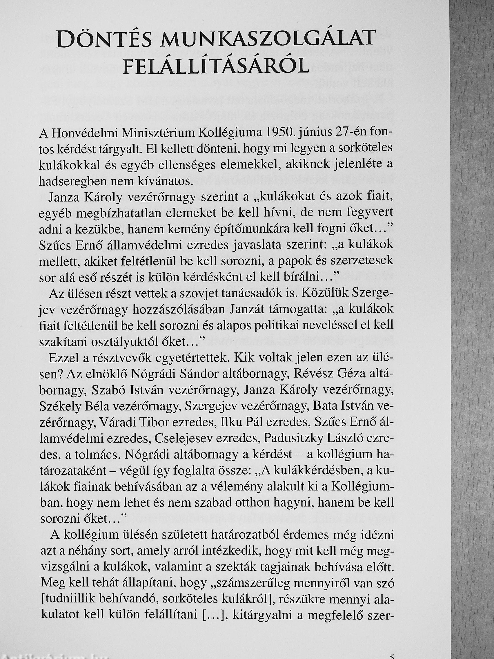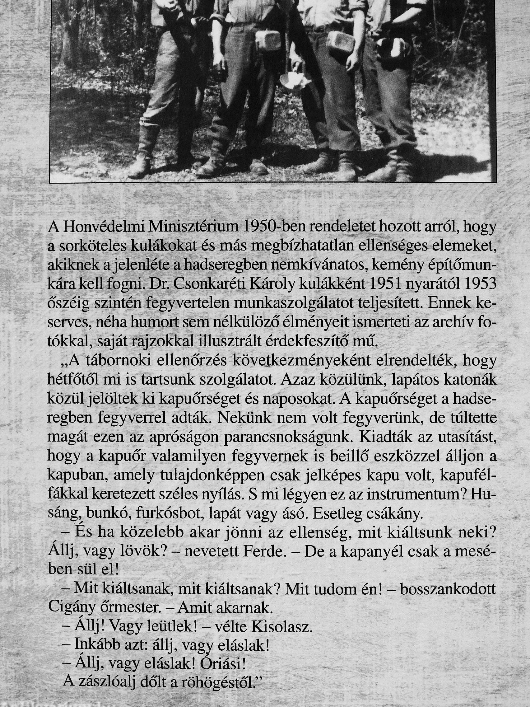 A Honvédelmi Minisztérium 1950-beii rendeletet hozott arról, hogy a sorköteles kulákokat és más megbízhatatlan ellenséges elemeket, akiknek a jelenléte a hadseregben nemkívánatos, kemény építőmunkára kell fogni. Dr. Csonkaréti Károly kulákként 1951 nyarától 1953 őszéig szintén fegyvertelen munkaszolgálatot teljesített. Ennek keserves, néha humort sem nélkülöző élményeit ismerteti az archív fotókkal, saját rajzokkal illusztrált érdekfeszítő mű.