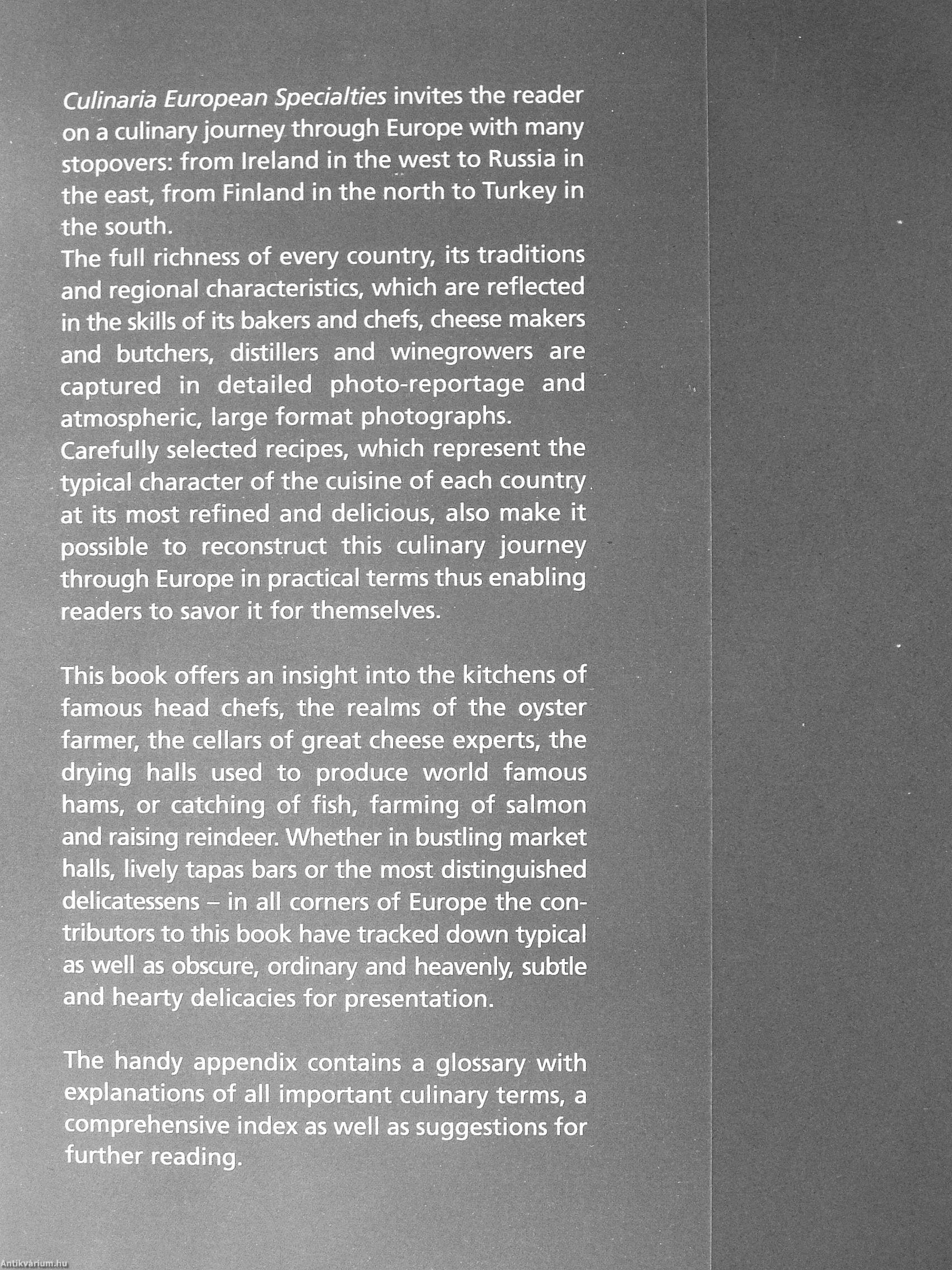 Culinaria European Specialties invites the reader on a culinary journey through Europe with many stopovers: from Ireland in the west to Russia in the east, from Finland in the north to Turkey in the south.