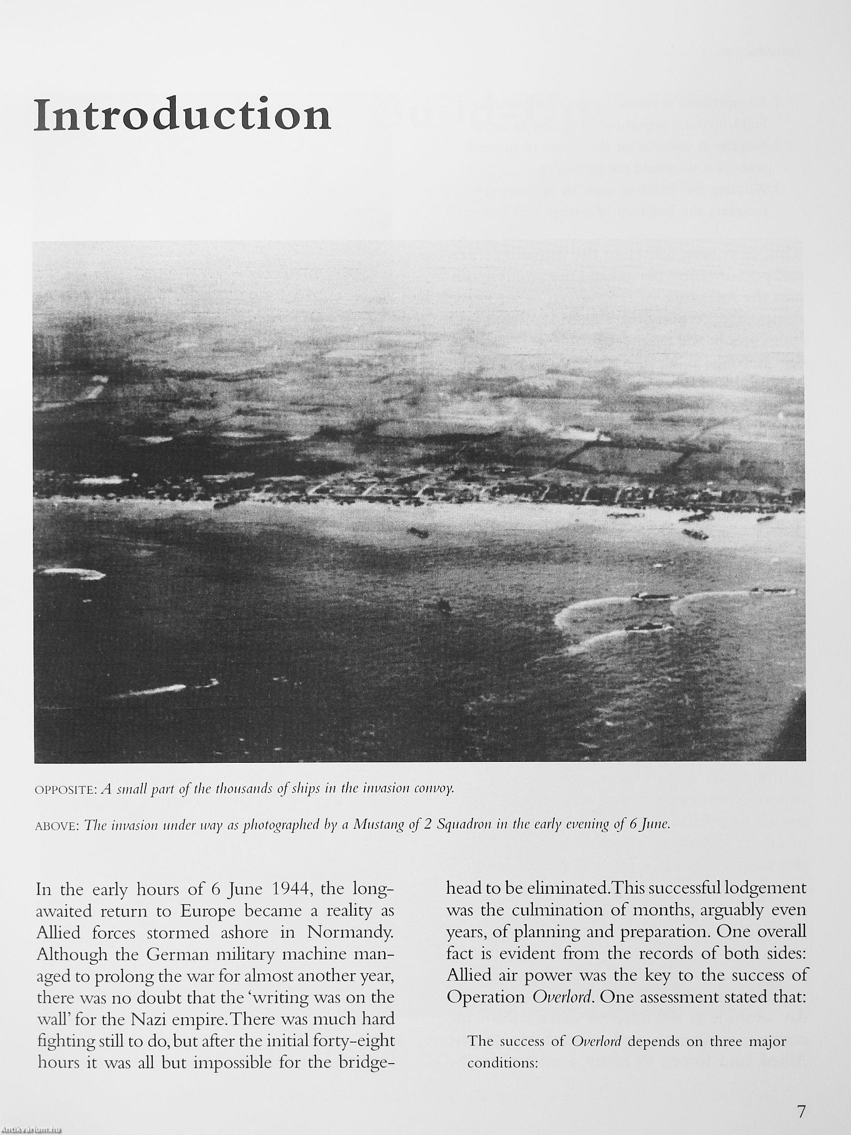 Operation overlord, the Allled invasion of occupied France, began In the opening minutes of 6 June 1944^ By the end of the day a bridgehead had been won and gradually the Allied forces extended their grip. None of this would have been possible without air power. In the weeks and months leading up to D-Day the raf and the usaaf waged a concerted campaign against the German military Infrastructure: fighter bases, road and rail routes and choke points, ammunition, fuel and troop depots; any target that would Impede the Germans' ability to repel the liberating forces. In the Invasion Itself thousands of troops were air-dropped or air-landed, and throughout the day fighter patrols swarmed over the area while fighter-bombers engaged ground targets. In the days that followed the landings, air power remained vitally important in expanding the bridgehead Into the path to final victory.