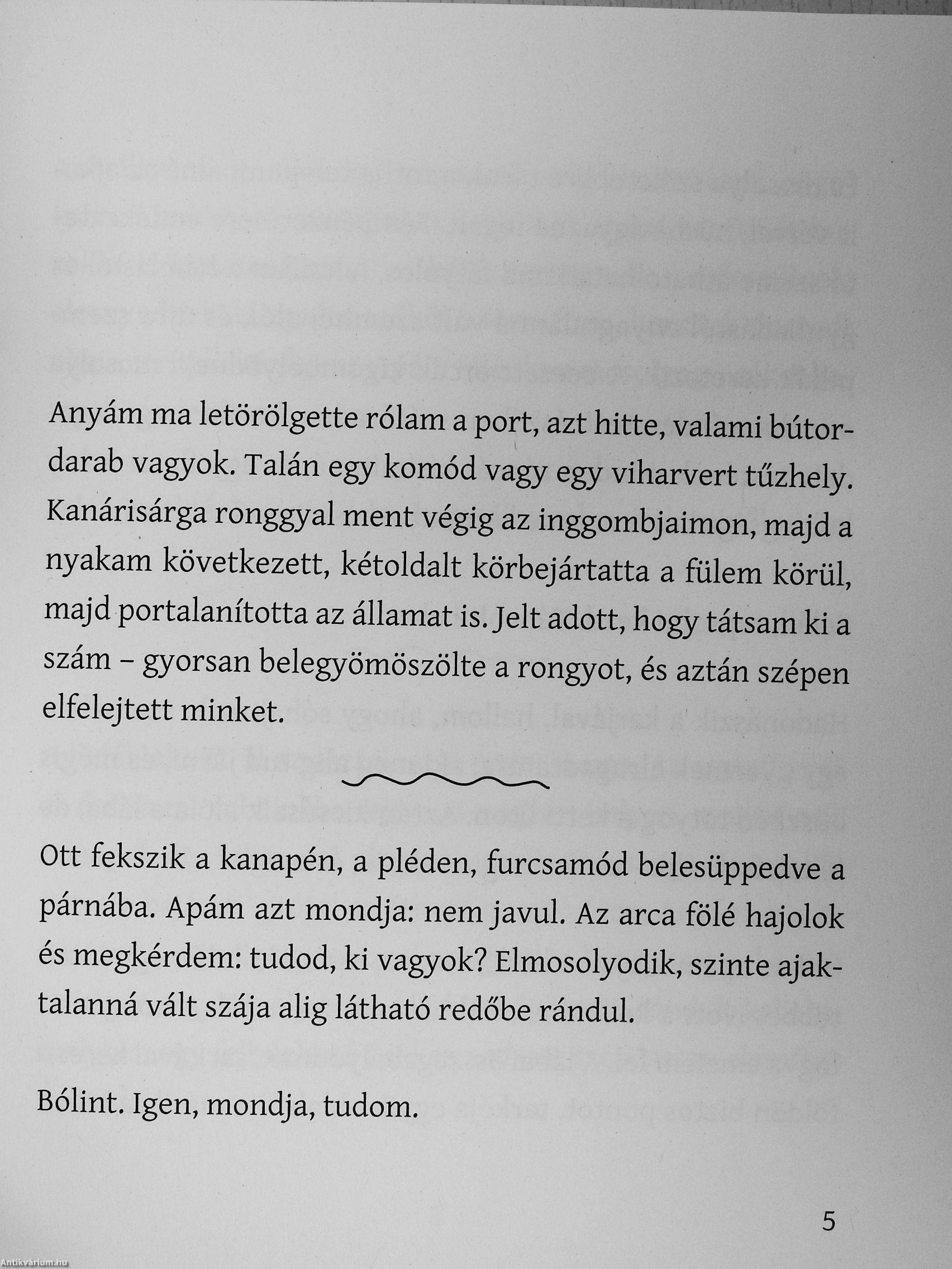 „Mérhetetlenül félünk. Keveset beszélünk róla, de mérhetetlenül félünk. Mérhetetlenül félünk attól, ami elkövetkezik, lett légyen bármennyire elkerülhetetlen. Mérhetetlenül félünk a gyásztól, amit akár már ma felvállalnánk, hogy ne kelljen többé élet és halál alkonyzónájában időzni. Ez se hús, se hal, se nappal, se éjszaka, se halál, se élet. A betegség anyámat kitapossa az időből, minket a nyelvből penderít ki. A szavak valamiféle gabonából összeállított reggelire emlékeztetnek mostanában: kétségtelenül egészséges, de meglehetősen ízetlen reggelire."