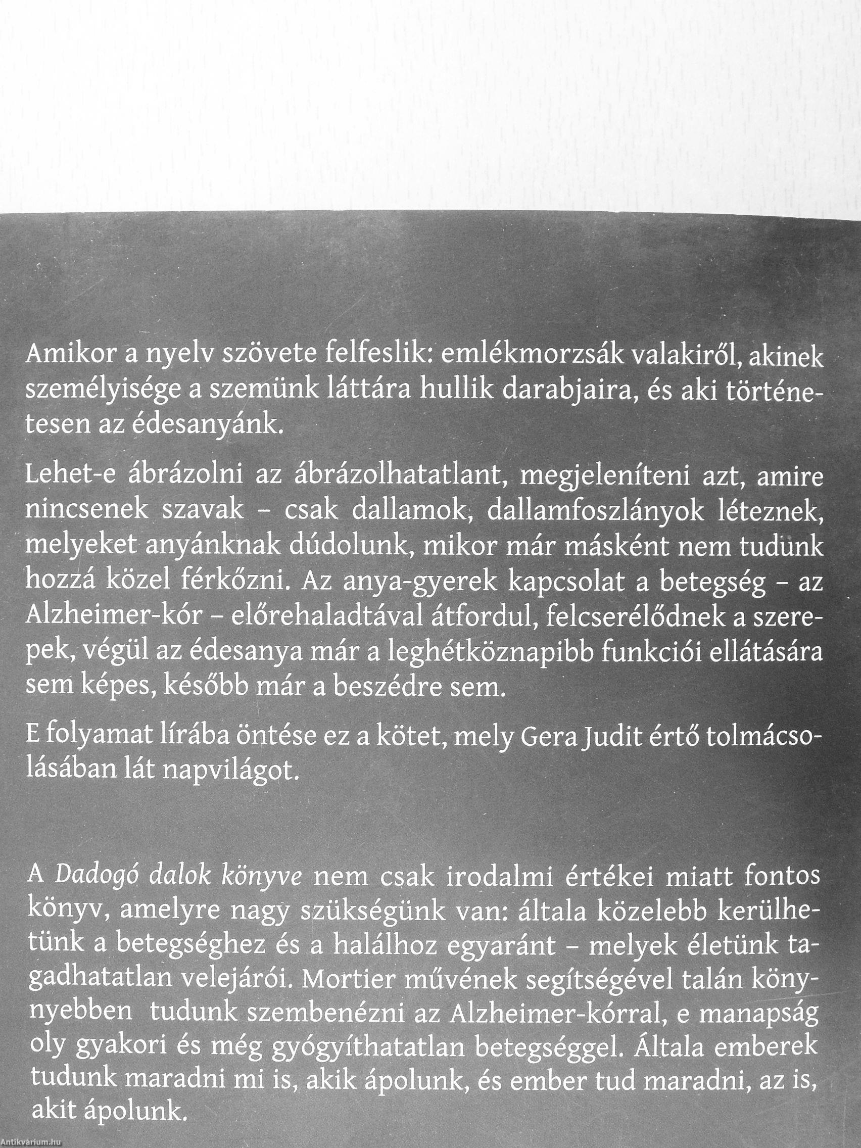 A Dadogó dalok könyve nem csak irodalmi értékei miatt fontos könyv, amelyre nagy szükségünk van: általa közelebb kerülhetünk a betegséghez és a halálhoz egyaránt - melyek életünk tagadhatatlan velejárói. Mortier művének segítségével talán köny-nyebben tudunk szembenézni az Alzheimer-kórral, e manapság oly gyakori és még gyógyíthatatlan betegséggel. Általa emberek tudunk maradni mi is. akik áoolunk. és ember tud maradni, az is. Vissza