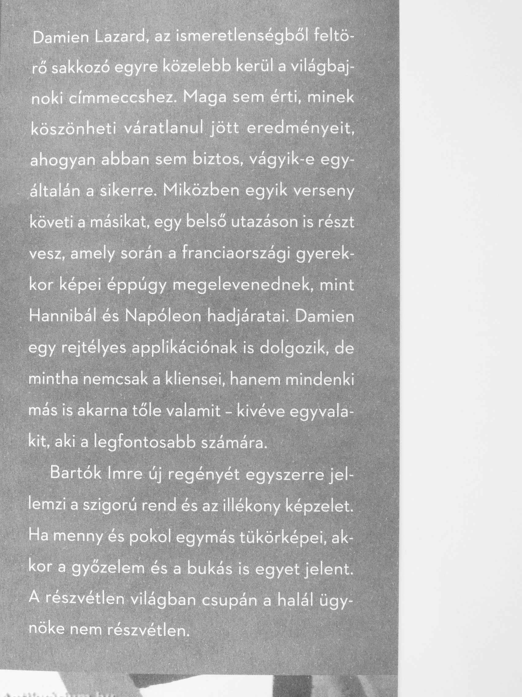 Bartók Imre új regényét egyszerre jellemzi a szigorú rend és az illékony képzelet. Ha menny és pokol egymás tükörképei, akkor a győzelem és a bukás is egyet jelent. A részvétlen világban csupán a halál ügynöke nem részvétlen.
