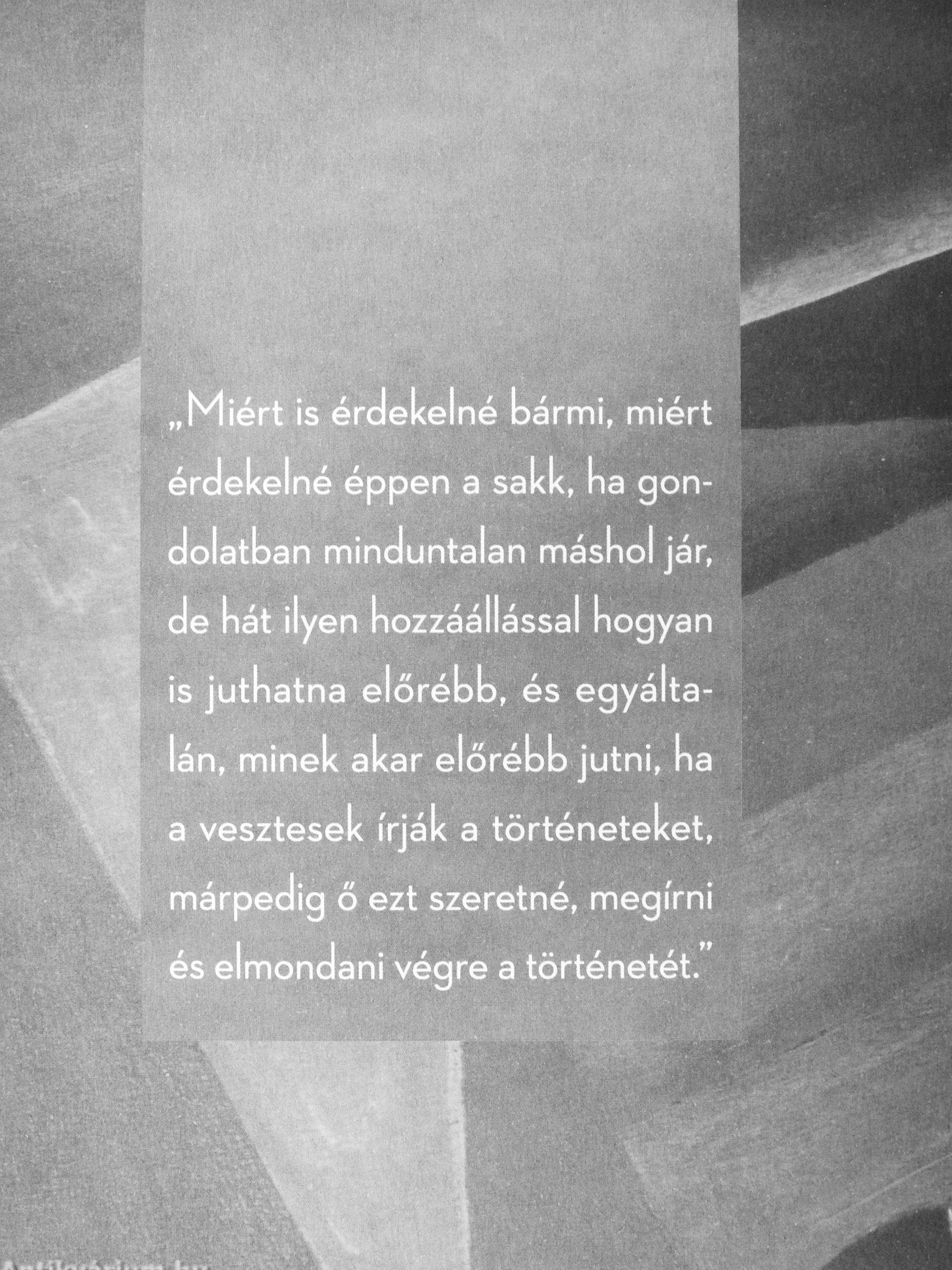„Miért is érdekelné bármi, miért érdekelné éppen a sakk, ha gondolatban minduntalan máshol jár, de hát ilyen hozzáállással hogyan is juthatna előrébb, és egyáltalán, minek akar előrébb jutni, ha a vesztesek írják a történeteket, márpedig ő ezt szeretné, megírni és elmondani végre a történetét.