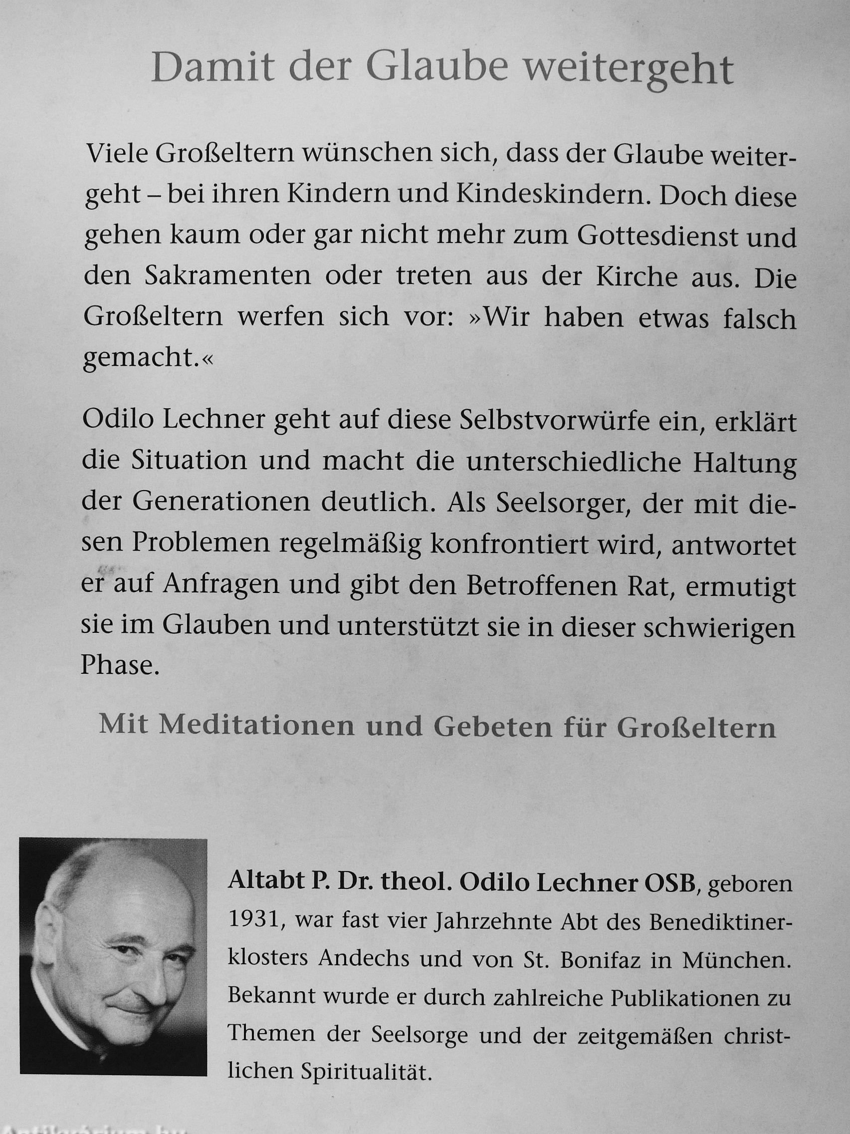 Altabt P. Dr. theol. Odilo Lechner OSB, geboren 1931, war fast vier Jahrzehnte Abt des Benediktinerklosters Andechs und von St. Bonifaz in München. Bekannt wurde er durch zahlreiche Publikationen zu Themen der Seelsorge und der zeitgemäßen christlichen Spiritualität.