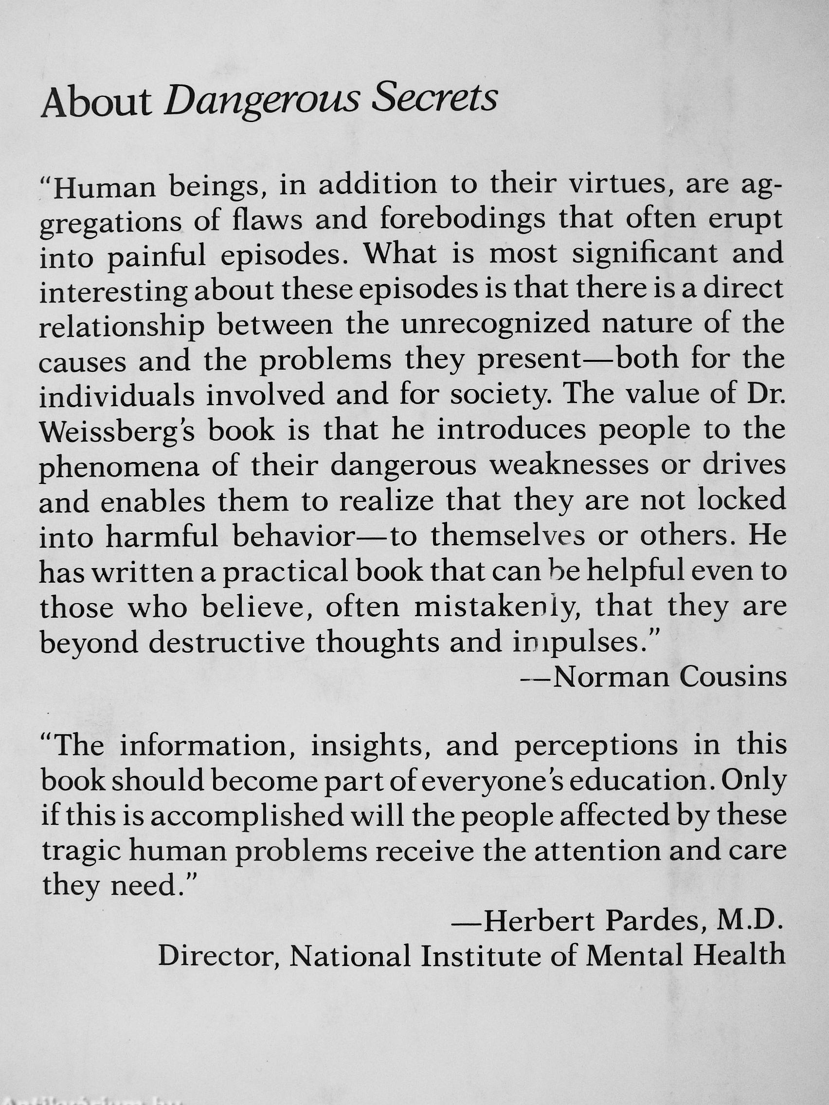 "Human beings, in addition to their virtues, are aggregations of flaws and forebodings that often erupt into painful episodes. What is most significant and interesting about these episodes is that there is a direct relationship between the unrecognized nature of the causes and the problems they present—both for the individuals involved and for society. The value of Dr. Weissberg's book is that he introduces people to the phenomena of their dangerous weaknesses or drives and enables them to realize that they are not locked into harmful behavior—to themselves or others. He has written a practical book that can be helpful even to those who believe, often mistakenly, that they are beyond destructive thoughts and impulses."