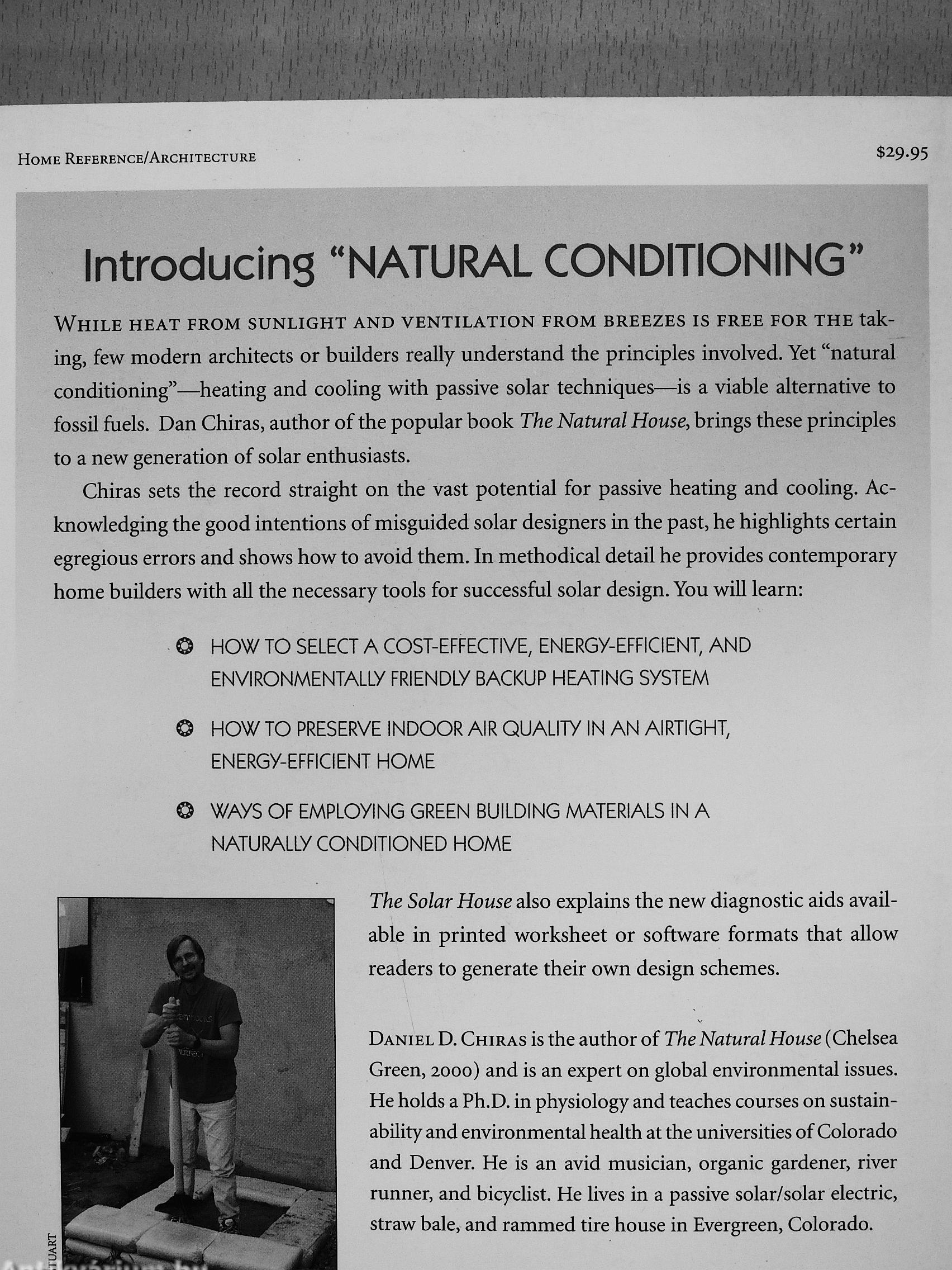 While heat from sunlight and ventilation from breezes is free for the taking, few modern architects or builders really understand the principles involved. Yet "natural conditioning"—heating and cooling with passive solar techniques—is a viable alternative to fossil fuels. Dan Chiras, author of the popular book The Natural House, brings these principles to a new generation of solar enthusiasts.