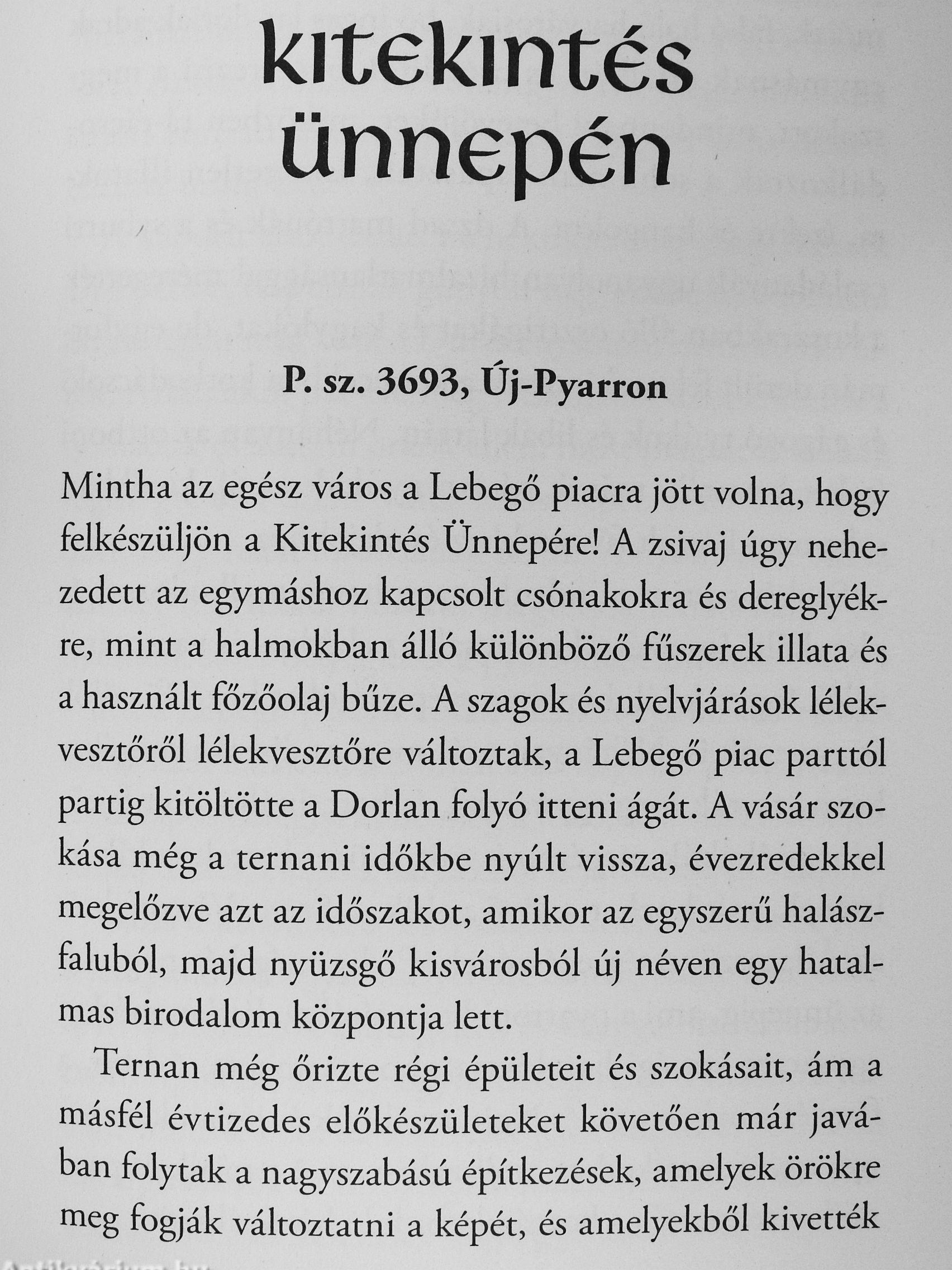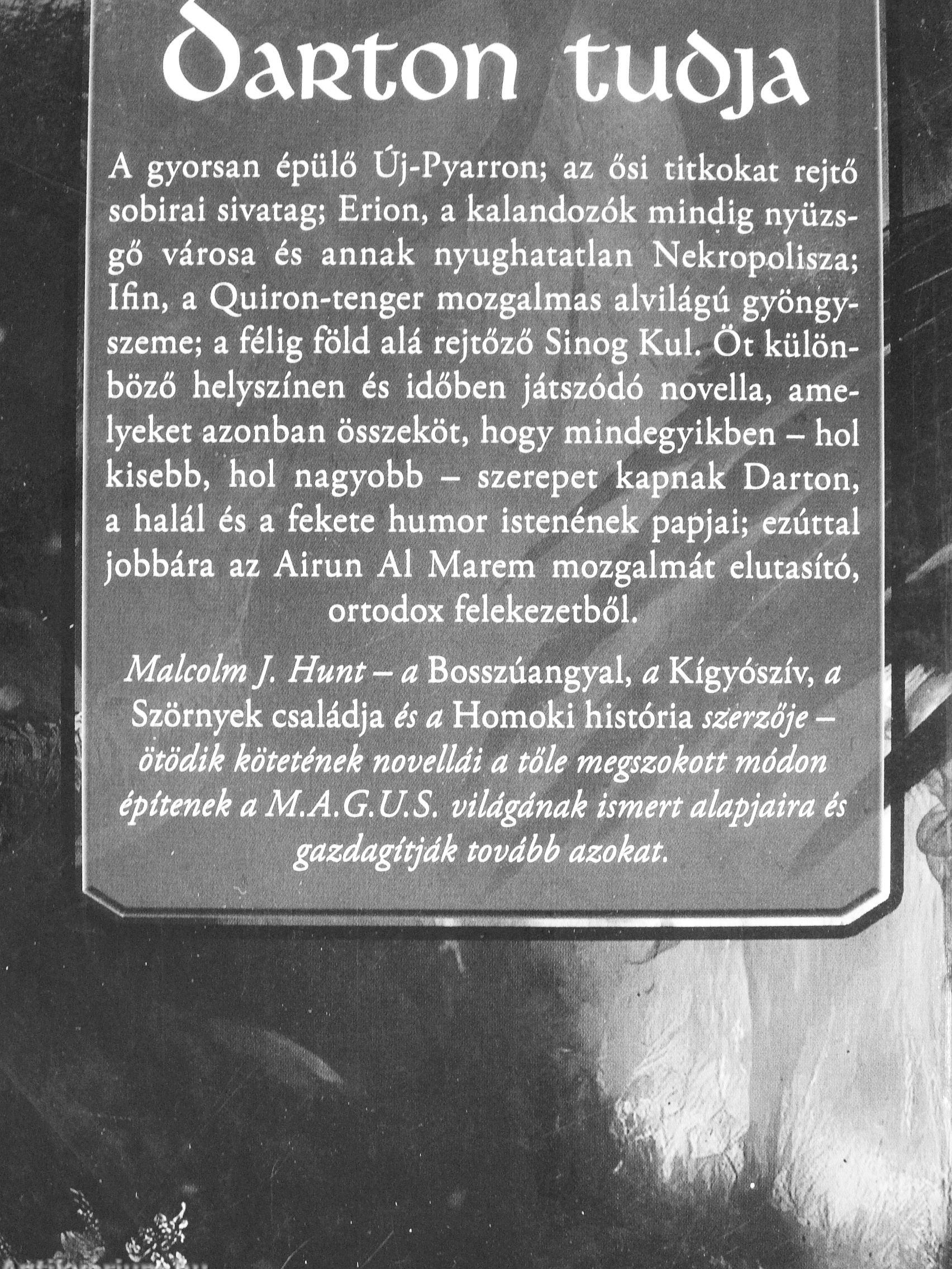 A gyorsan épülő Üj-Pyarron; az ősi titkokat rejtő sobirai sivatag; Erion, a kalandozók mindig nyüzsgő városa és annak nyughatatlan Nekropolisza; Ifin, a Quiron-tenger mozgalmas alvilágú gyöngyi szeme; a félig föld alá rejtőző Sinog Kul. Öt különböző helyszínen és időben játszódó novella, amelyeket azonban összeköt, hogy mindegyikbeti - hol kisebb, hol nagyobb - szerepet kapnak Darton, a halál és a fekete humor istenének papjai; ezúttal jobbára az Airun Al Marem mozgalmát elutasító, .: ¦ f:::? ortodox felekezetből. ^ ^ ^ ^ . . .^