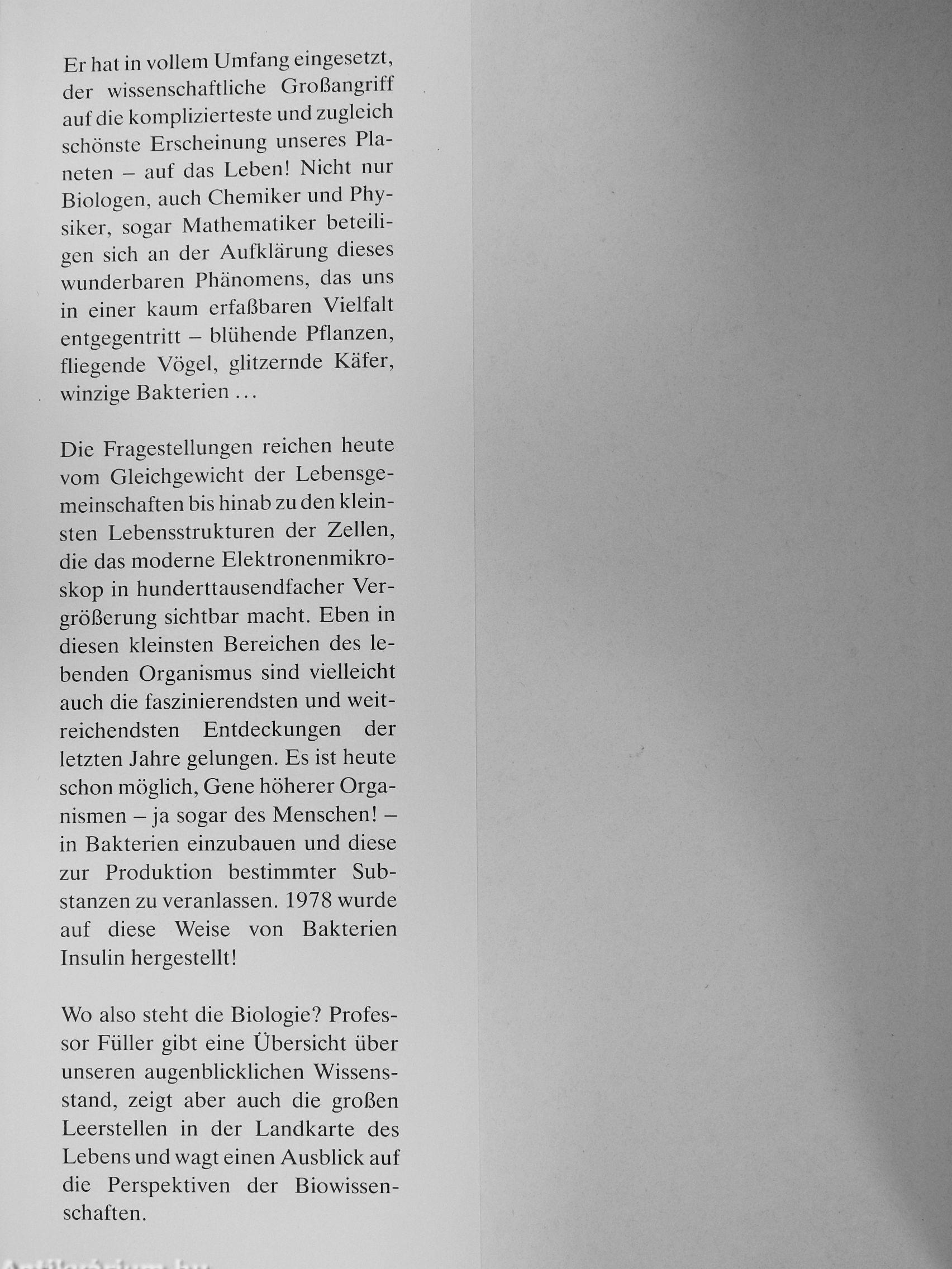 Wo also steht die Biologie? Professor Füller gibt eine Übersicht über unseren augenblicklichen Wissensstand, zeigt aber auch die großen Leerstellen in der Landkarte des Lebens und wagt einen Ausblick auf die Perspektiven der Biowissenschaften.