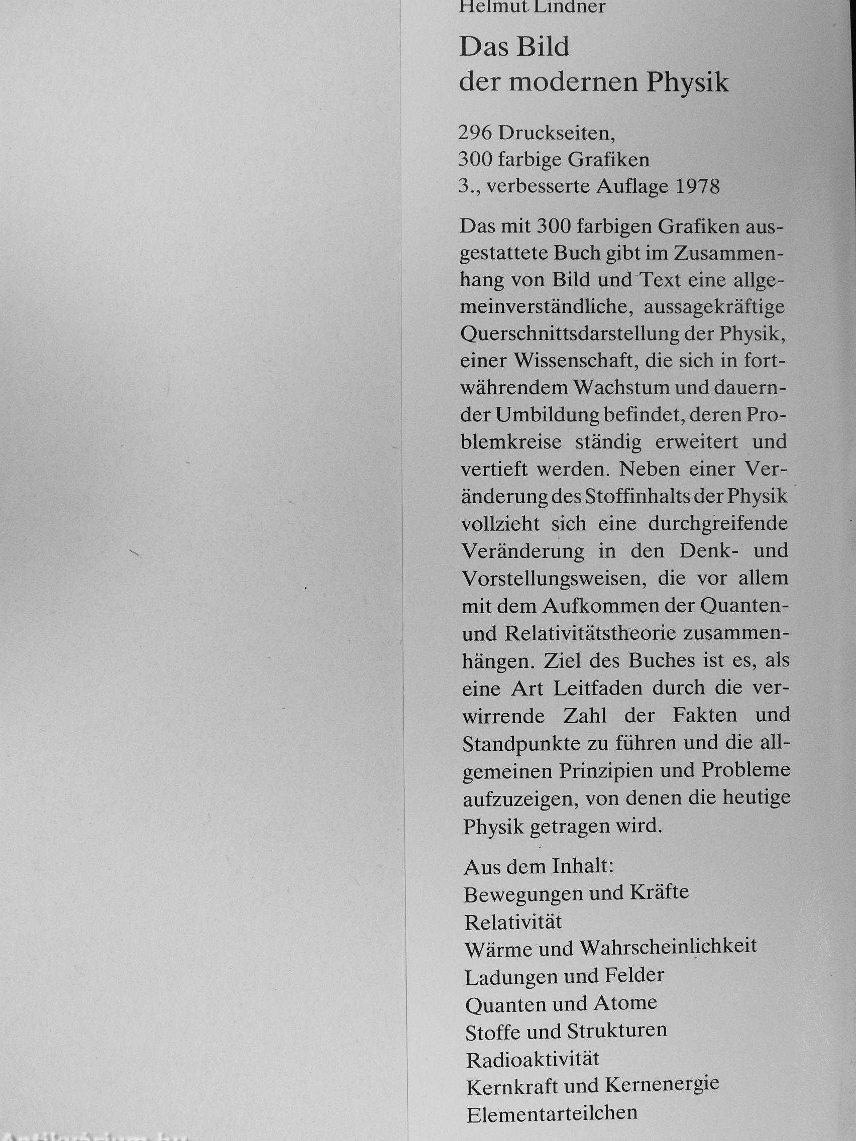 Das mit 300 farbigen Grafiken ausgestattete Buch gibt im Zusammenhang von Bild und Text eine allgemeinverständliche, aussagekräftige Querschnittsdarstellung der Physik, einer Wissenschaft, die sich in fortwährendem Wachstum und dauernder Umbildung befindet, deren Problemkreise ständig erweitert und vertieft werden. Neben einer Veränderung des Stoffinhalts der Physik vollzieht sich eine durchgreifende Veränderung in den Denk- und Vorstellungsweisen, die vor allem mit dem Aufkommen der Quanten-und Relativitätstheorie zusammenhängen. Ziel des Buches ist es, als eine Art Leitfaden durch die verwirrende Zahl der Fakten und Standpunkte zu führen und die allgemeinen Prinzipien und Probleme aufzuzeigen, von denen die heutige Physik getragen wird.