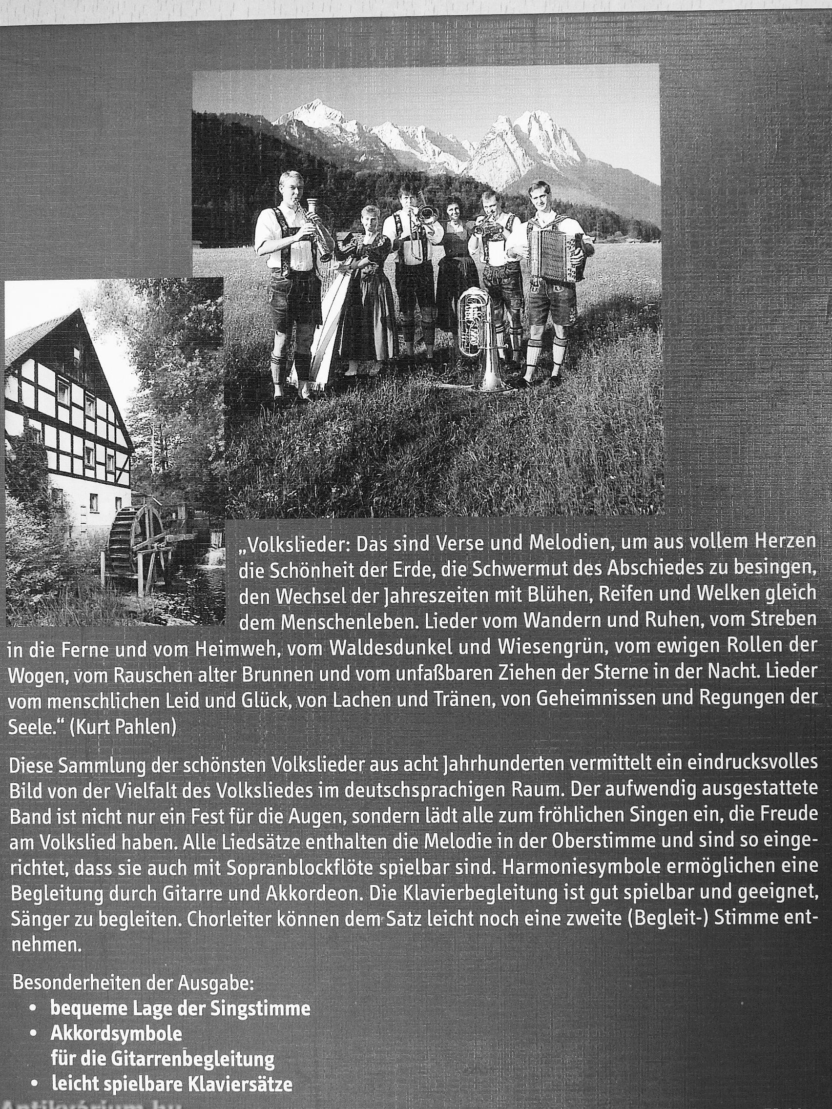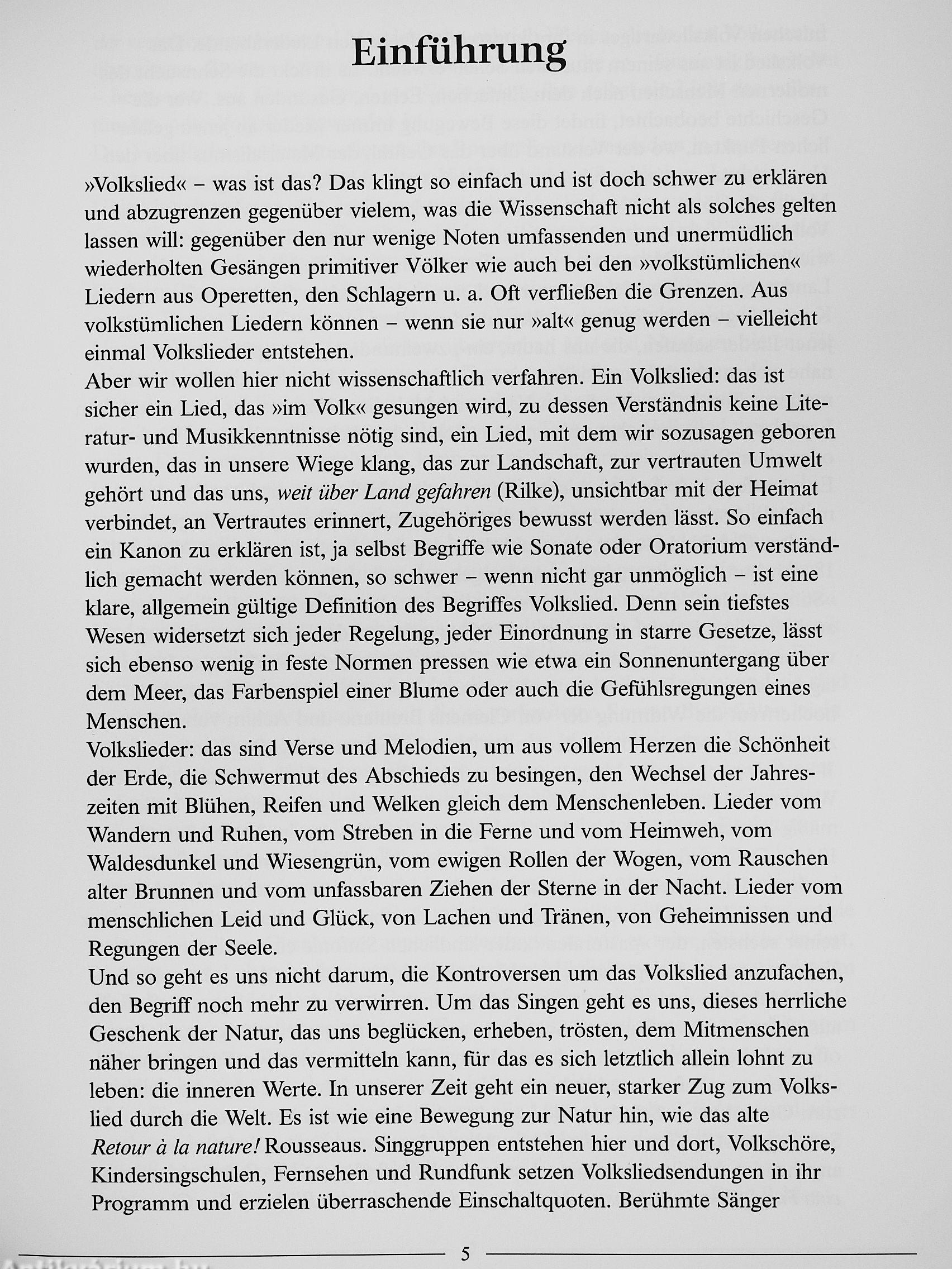 Diese Sammlung der schönsten Volkslieder aus acht Jahrhunderten vermittelt ein eindrucksvolles Bild von der Vielfalt des Volksliedes im deutschsprachigen Raum. Der aufwendig ausgestattete Band ist nicht nur ein Fest für die Augen, sondern lädt alle zum fröhlichen Singen ein, die Freude am Volkslied haben. Alle Liedsätze enthalten die Melodie in der Oberstimme und sind so eingerichtet, dass sie auch mit Sopranblockflöte spielbar sind. Harmoniesymbole ermöglichen eine Begleitung durch Gitarre und Akkordeon. Die Klavierbegleitung ist gut spielbar und geeignet, Sänger zu begleiten. Chorleiter können dem Satz leicht noch eine zweite (Begleit-) Stimme entnehmen.