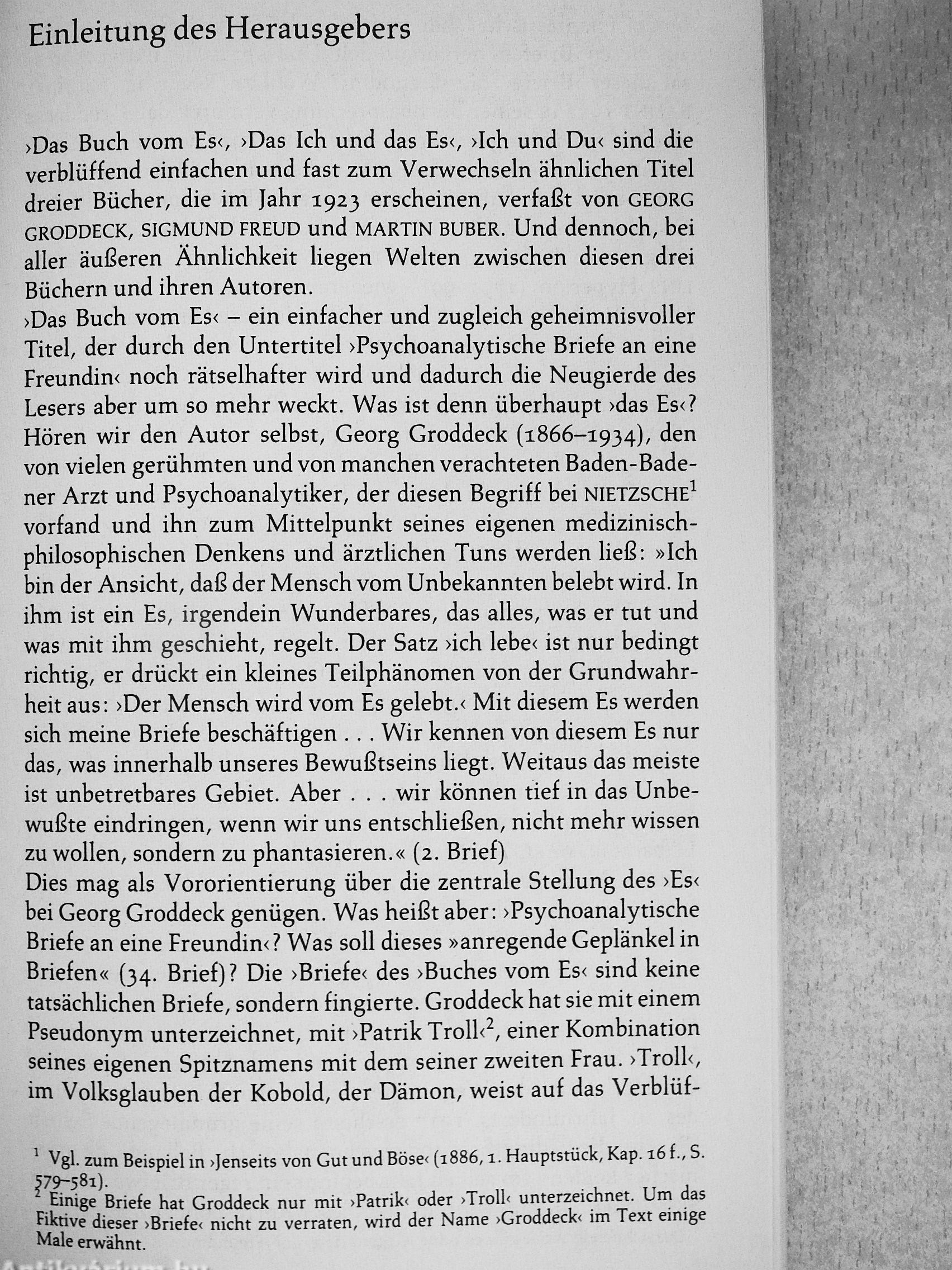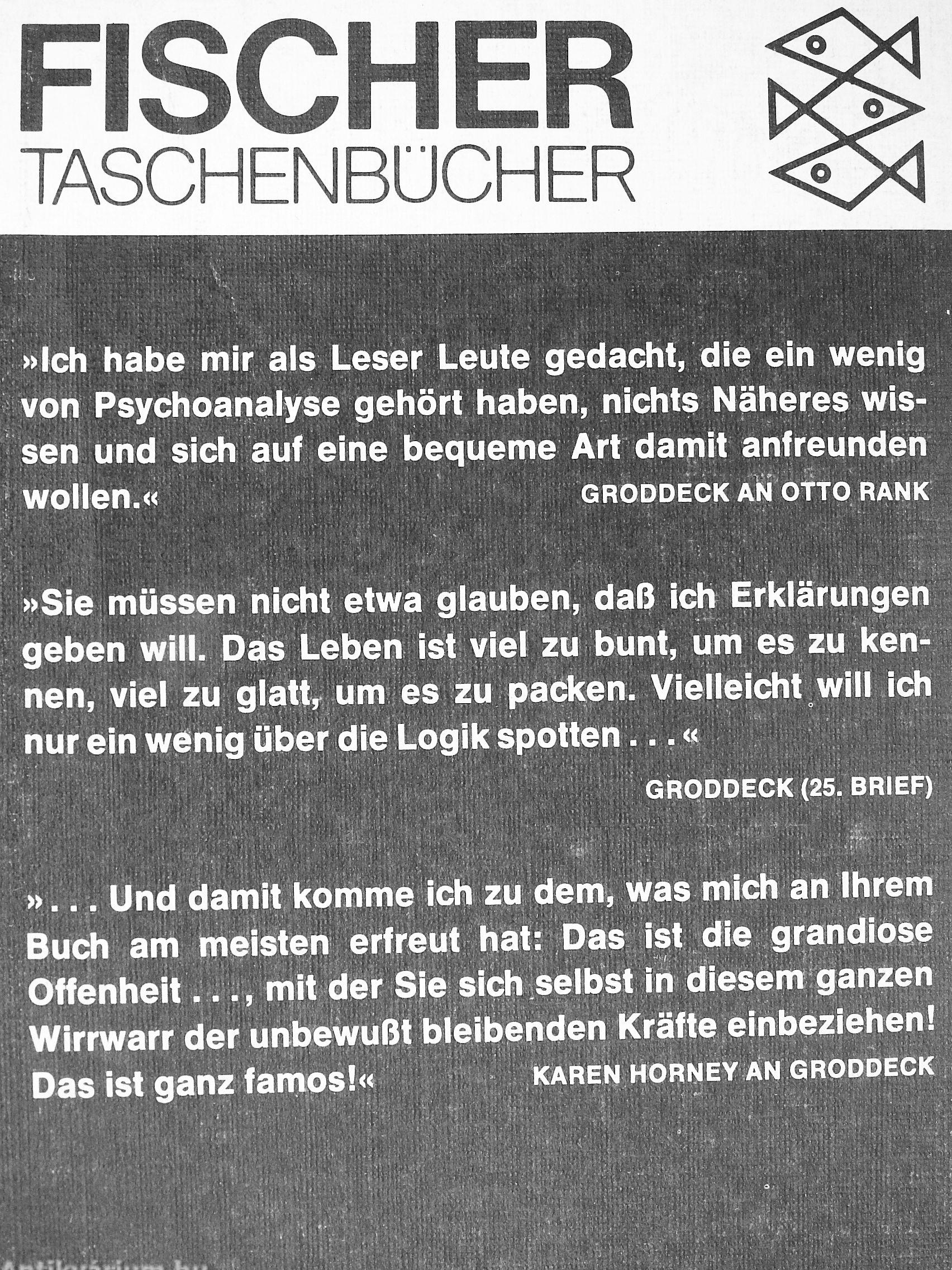 » Und damit komme ich zu dem, was mich an Ihrem Buch am meisten erfreut hat: Das ist die grandiose Offenheit , mit der Sie sich selbst In diesem ganzen Wirrwarr der unbewußt blieibenden Kräfte einbeziehen' Das ist ganz famos!« karen hörney an groddeck