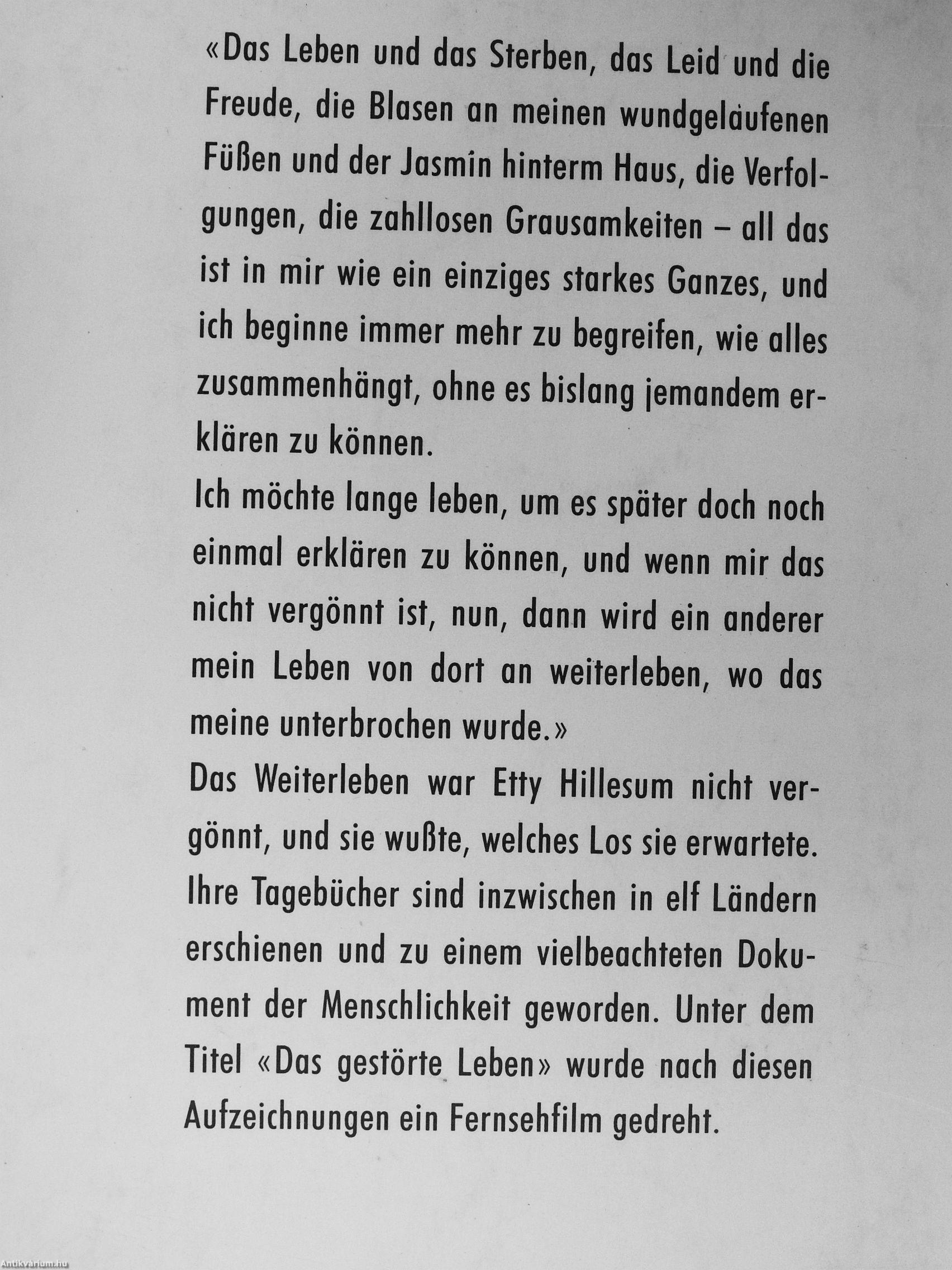 Ich möchte lange leben, um es später doch noch einmal erklären zu können, und wenn mir das nicht vergönnt ist, nun, dann wird ein anderer mein Leben von dort an weiterleben, wo das meine unterbrochen wurde.» Das Weiterleben war Etty Hillesum nicht vergönnt, und sie wußte, welches Los sie erwartete. Ihre Tagebücher sind inzwischen in elf Ländern erschienen und zu einem vielbeachteten Dokument der Menschlichkeit geworden. Unter dem Titel «Das gestörte Leben» wurde nach diesen Aufzeichnungen ein Fernsehfilm gedreht.