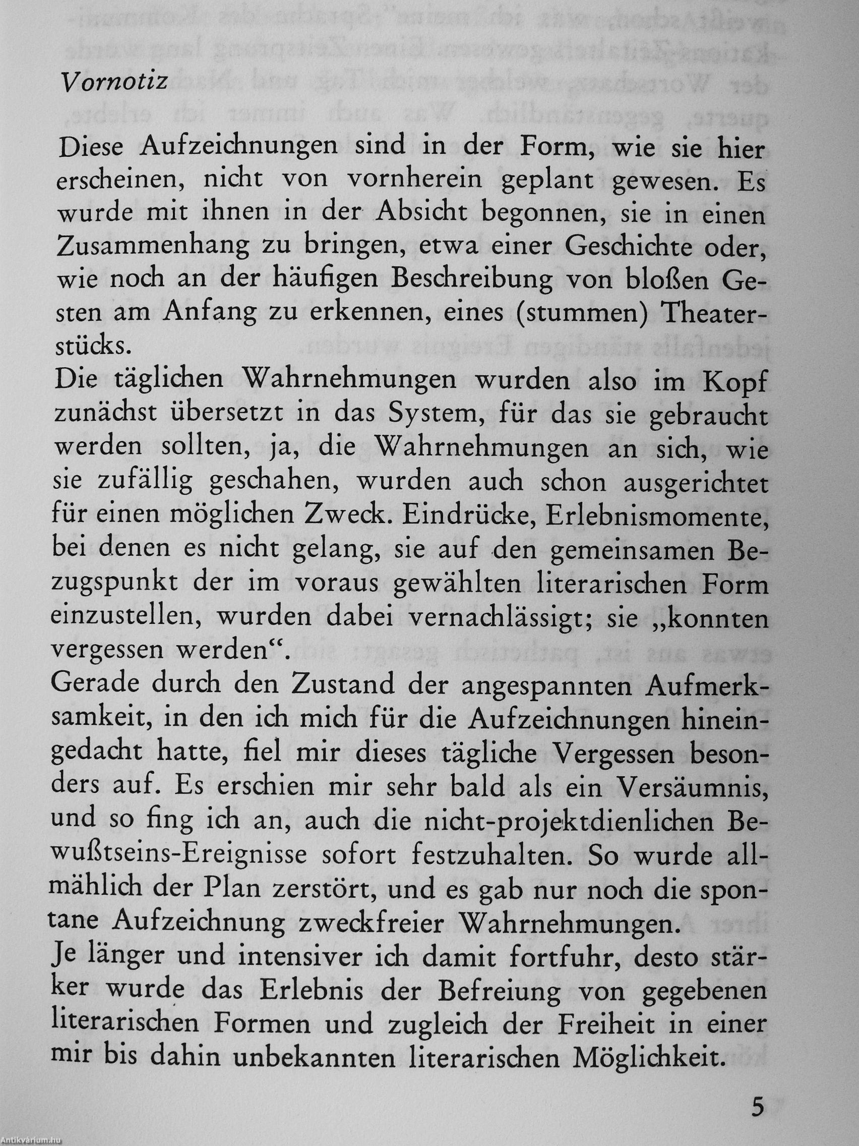»Ich übte mich nun darin, auf alles, was mir zustieß, sofort mit Sprache zu reagieren, und merkte, wie im Moment des Erlebnisses gerade diesen Moment lang auch die Sprache sich belebte und mitteilbar wurde; einen Moment später wäre es schon wieder die täglich gehörte, vor Vertrautheit nichtssagende, hilflose, privatisierende >Du weißt schon, was ich meine<-Sprache des ^^ Kommunikations-Zeitalters gewesen7% Einen Moment lang wurde der Wortschatz, welcher mich Tag und Nacht durchquerte, gegenständlich,v;a-,uf eine (mich und andere) erlösend^ Weise. Was auch immer ich privat erlebte, erschien in diesem >Augenblick der Sprache< von jeder Privatheit befreit und allgemein.«