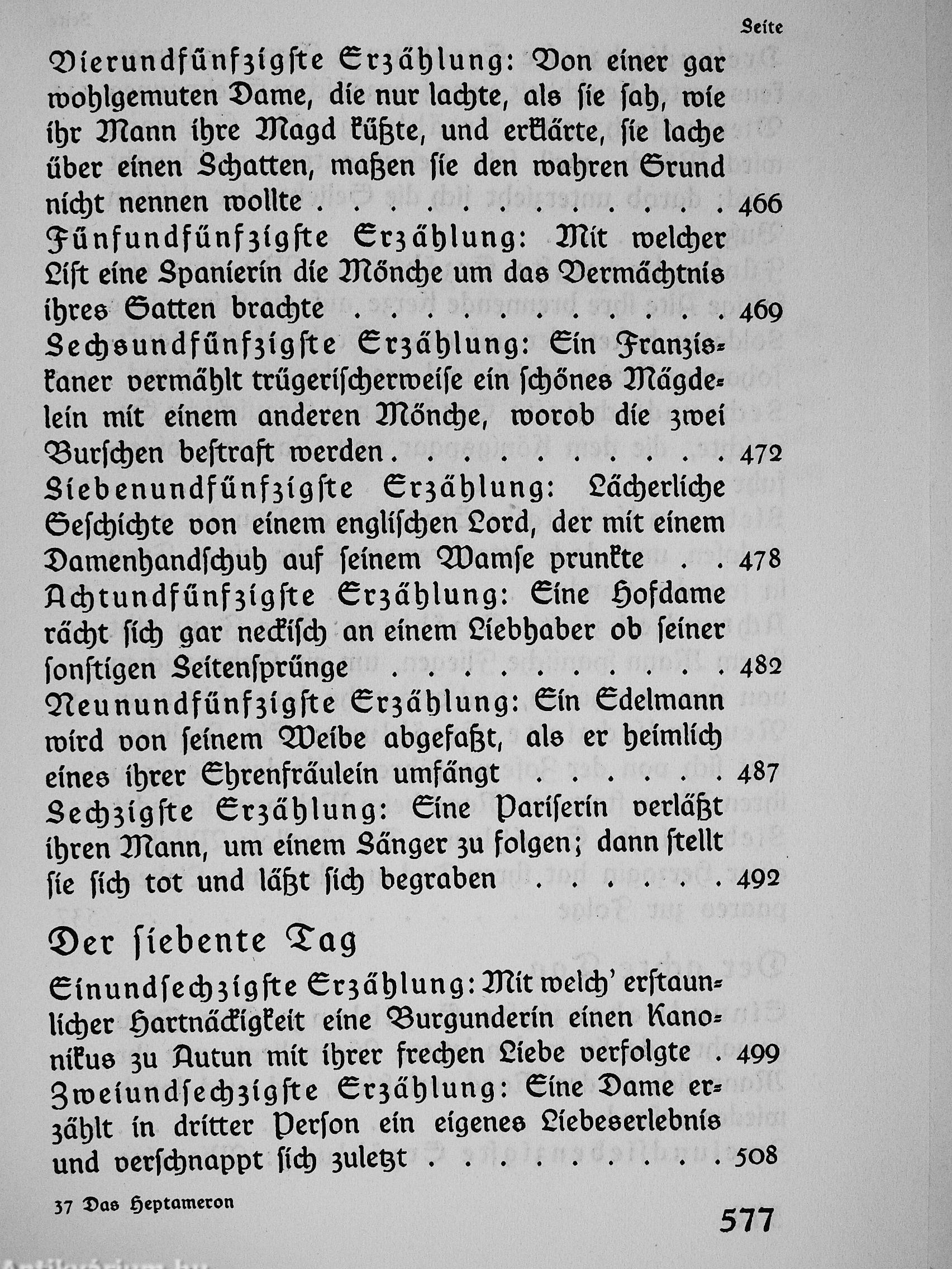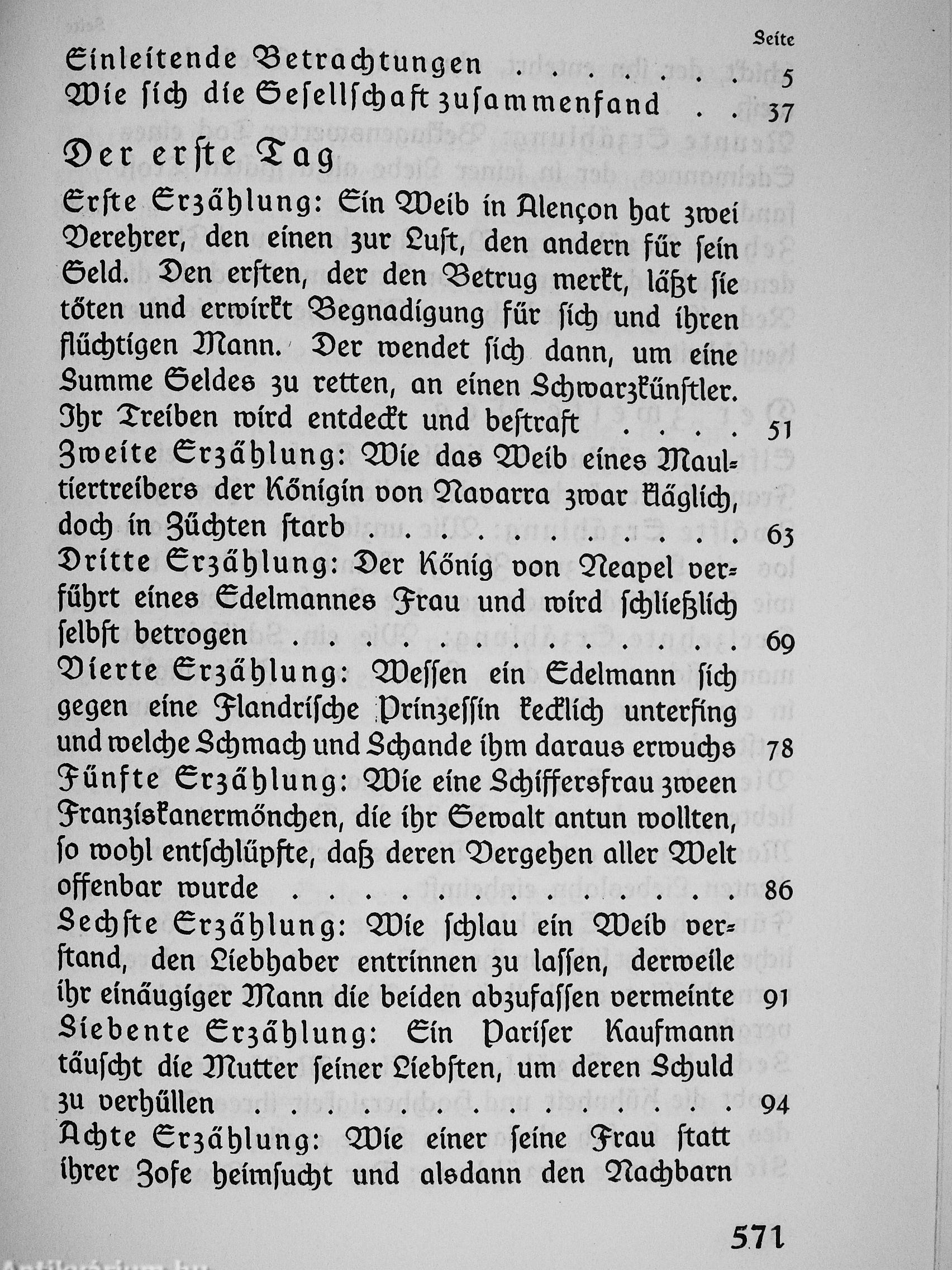 A nagy esőzés veszteglésre kényszerít egy francia nemesurakból és úrihölgyekből álló társaságot egy dél-franciaországi apátságban. Hogy unalmukat elűzzék, elhatározzák: amíg el nem készül a megáradt folyón átvezető híd, igaz történetekkel mulattatják majd önmagukat s egymást. - A tíz napra tervezett pihenő történeteiben megelevenedik a színes francia reneszánsz, I. Ferenc király uralkodásának mozgalmas kora. Erőszakos és kegyetlen hercegek, jámbor és bölcs fejedelmek, sima szavú udvaroncok, csalafinta udvarhölgyek, felszarvazott férjek és kikapós menyecskék, kéjre és pénzre sóvárgó barátok, furfangos kereskedők, ármányos ügyvédek, együgyű parasztok mulatságos vagy drámai alakját kelti életre Margit királyasszony tolla. S ami különös pikantériával fűszerezi a történeteket: a szereplők többnyire valóságos személyek, a királyi család és közvetlen környezete. - Mese és valóság, szelídség és kegyetlenség, bosszú és megbocsátás, vidám érzékiség és komor önsanyargatás, derűs istentagadás...