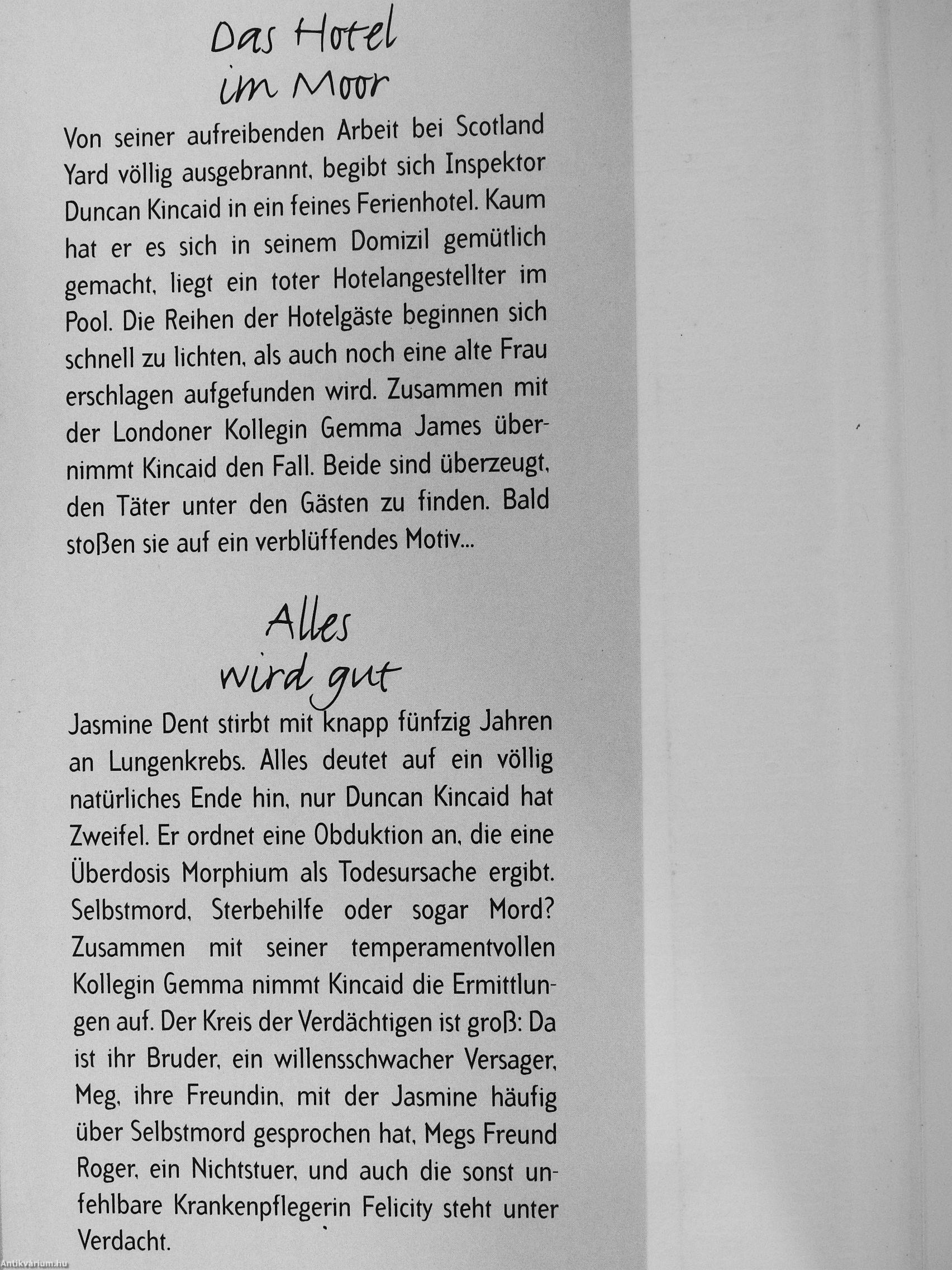 Jasmine Dent stirbt mit Knapp fünfzig Jahren an Lungenkrebs. Alles deutet auf ein völlig natürliches Ende hin, nur Duncan Kincaid hat Zweifel. Er ordnet eine Obduktion an, die eine Überdosis Morphium als Todesursache ergibt. Selbstmord, Sterbehilfe oder sogar Mord? Zusammen mit seiner temperamentvollen Kollegin Gemma nimmt Kincaid die Ermittlungen auf. Der Kreis der Verdächtigen ist groß: Da ist ihr Bruder, ein willensschwacher...