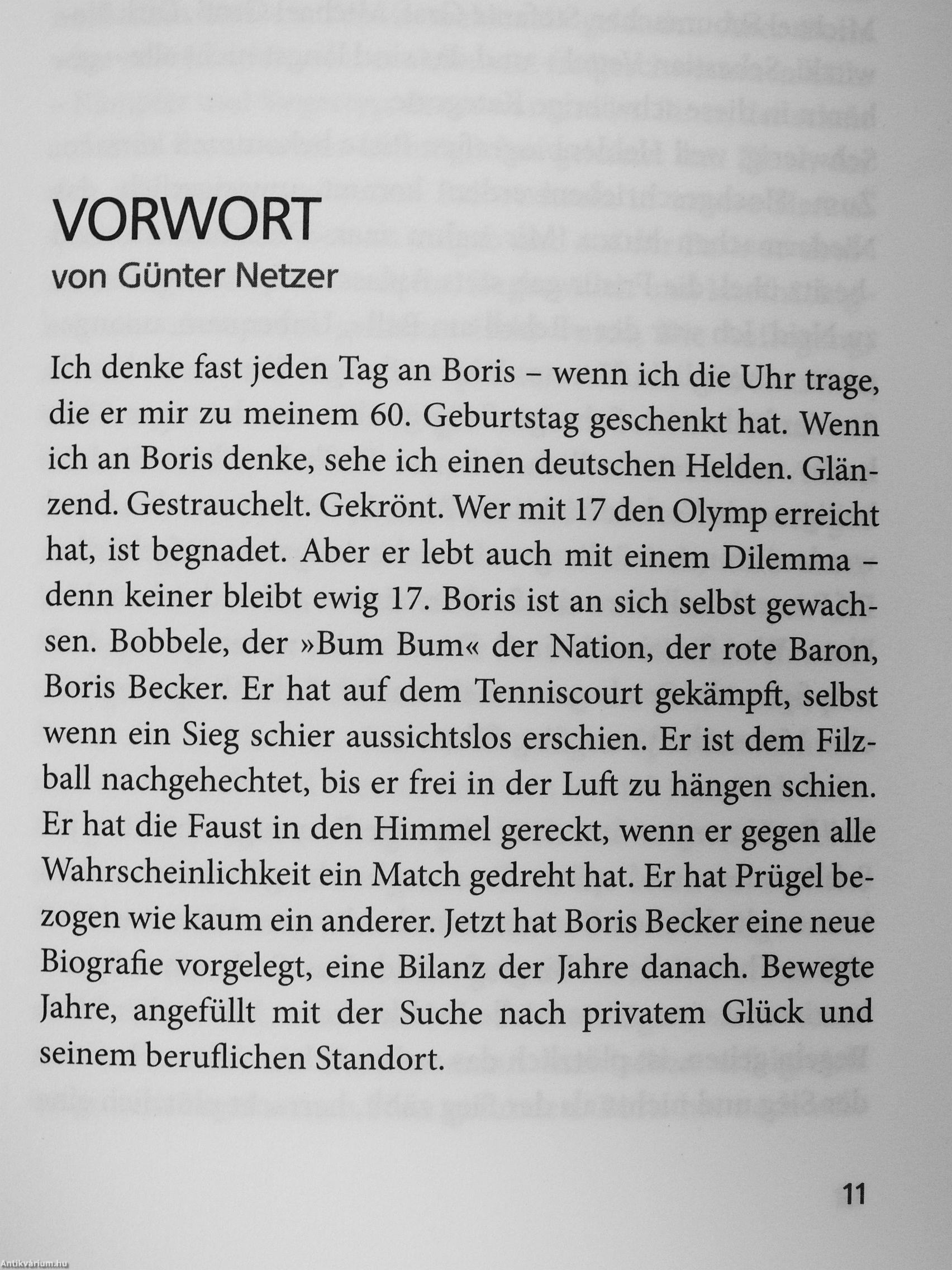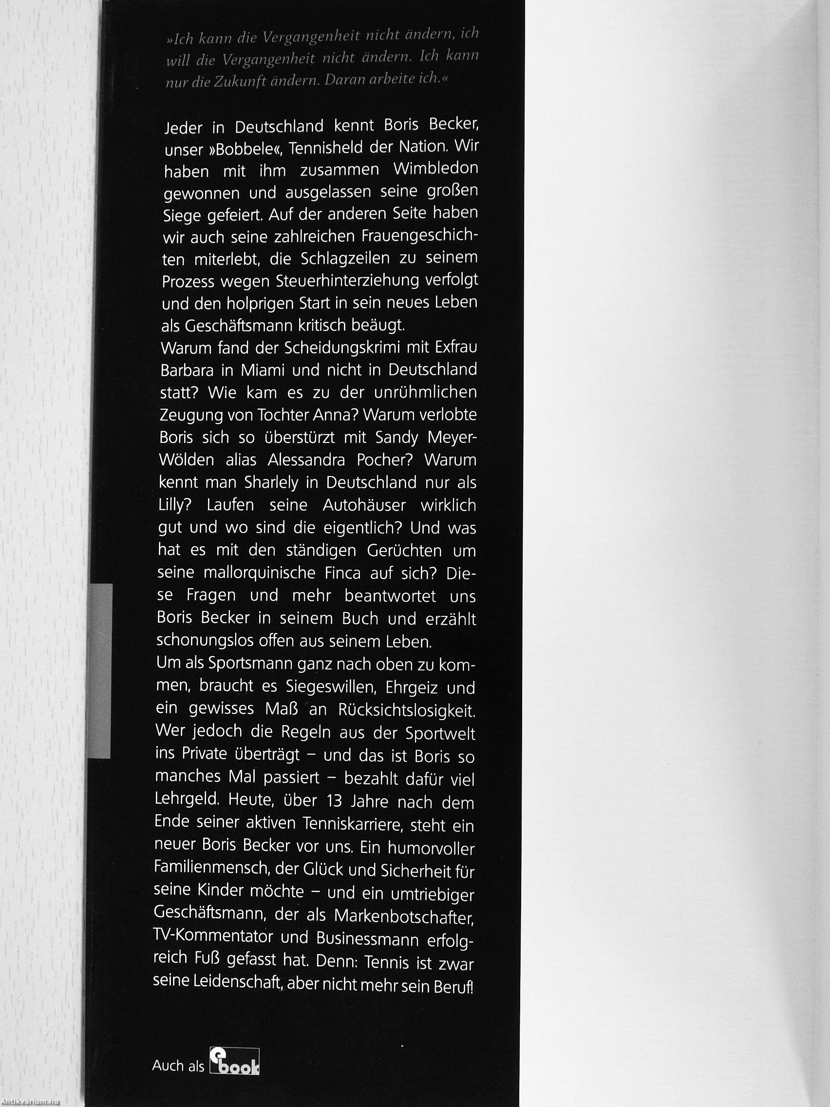 Zwischen diesen Buchdeckeln gibt es 100 Prozent Boris Becker - und so manches Gegenbild zu den Klischees, die man. kennt: Boris, der notorische Fremdgeher, der arrogante Macho, der geschäftliche Totalversager. Hier steht die Wahrheit, und zwar die ganze Wahrheit, über seifi Glück und Pech