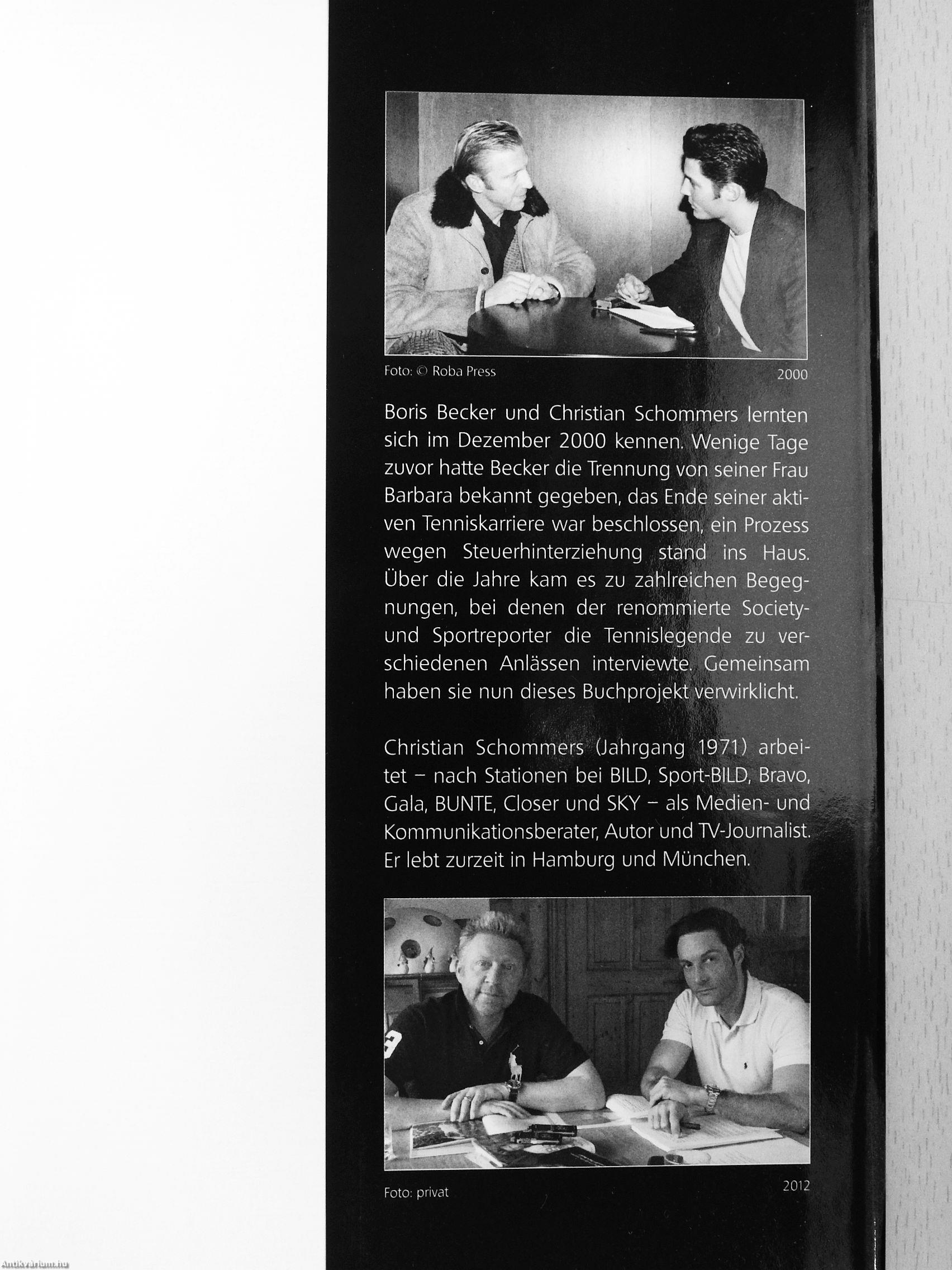 Boris Becker und Christian Schommers lernten sich im Dezember 2000 kennen. Wenige Tage zuvor hatte Becker die Trennung von seiner Frau Barbara bekannt gegeben, das Ende seiner aktiven Tenniskarriere war beschlossen,, ein Prozess wegen Steuerhinterziehung stand ins Haus. Über die Jahre kam es zu zahlreichen Begegnungen, bei denen der renommierte Society-und Sportreporter die Tennislegende zu verschiedenen Anlässen interviewte. Gemeinsam haben sie nun dieses Buchprojekt verwirklicht,