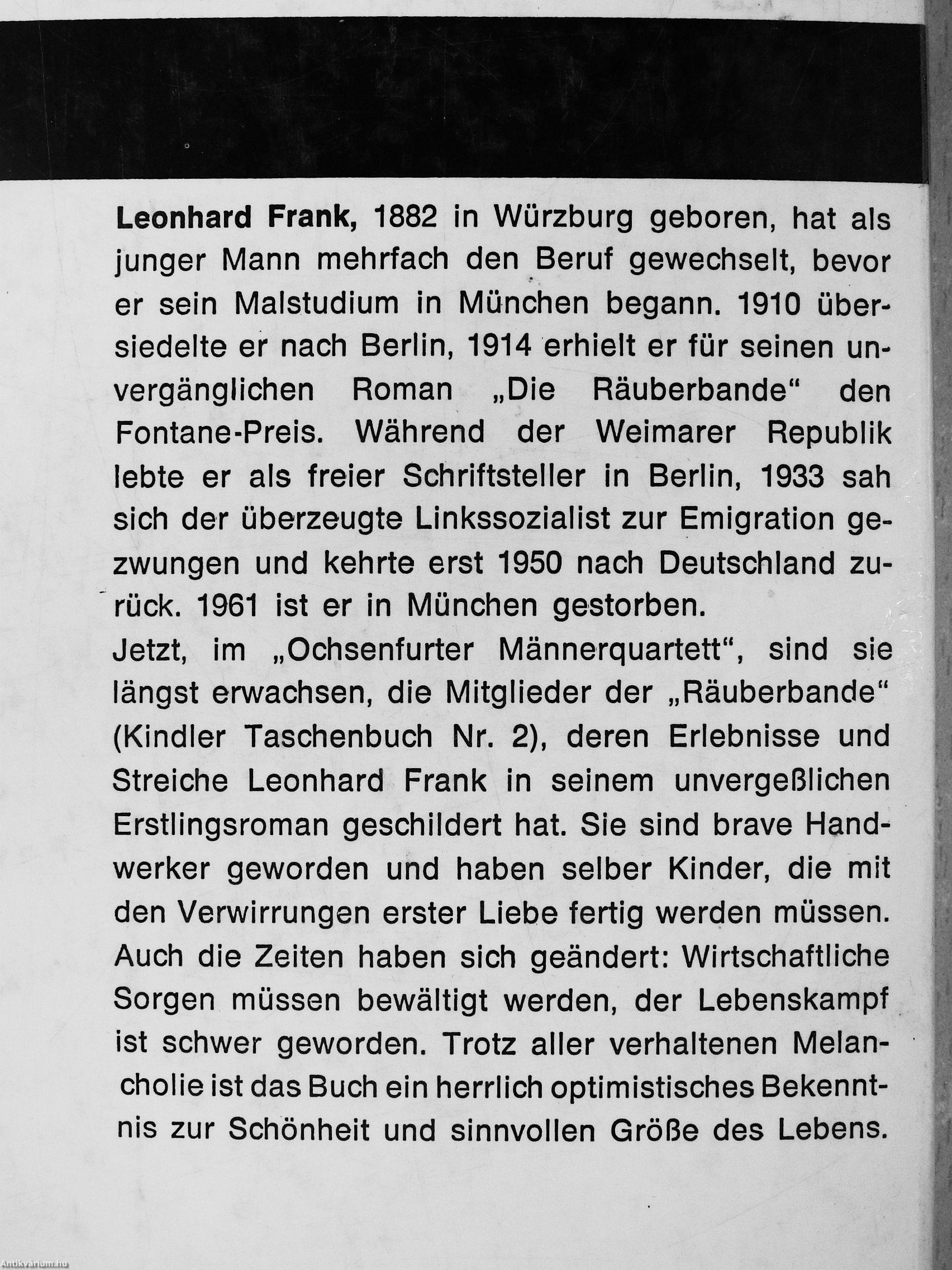 Leonhard Frank, 1882 in Würzburg geboren, hat als junger Mann mehrfach den Beruf gewechselt, bevor er sein Malstudium in München begann. 1910 übersiedelte er nach Berlin, 1914 erhielt er für seinen unvergänglichen Roman „Die Räuberbande" den Fontane-Preis. Während der Weimarer Republik lebte er als freier Schriftsteller in Berlin, 1933 sah sich der überzeugte Linkssozialist zur Emigration gezwungen und kehrte erst 1950 nach Deutschland zurück. 1961 ist er in München gestorben. Jetzt, im „Ochsenfurter Männerquartett", sind sie längst erwachsen, die Mitglieder der „Räuberbande" (Kindler Taschenbuch Nr. 2), deren Erlebnisse und Streiche Leonhard Frank in seinem unvergeßlichen Erstlingsroman geschildert hat. Sie sind brave Handwerker geworden und haben selber Kinder, die mit den Verwirrungen erster Liebe fertig werden müssen. Auch die Zeiten haben sich geändert: Wirtschaftliche Sorgen müssen bewältigt werden, der Lebensl<ampf ist schwer geworden. Trotz aller verhaltenen Melancholie ist das Buch ein herrlich optimistisches Bekenntnis zur Schönheit und sinnvollen Größe des Lebens,