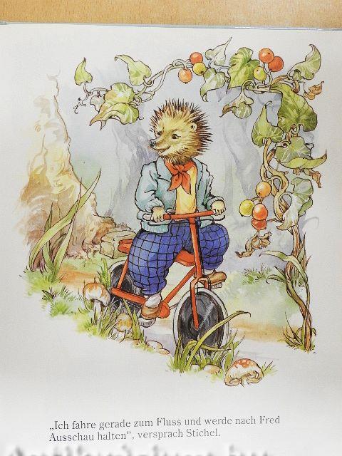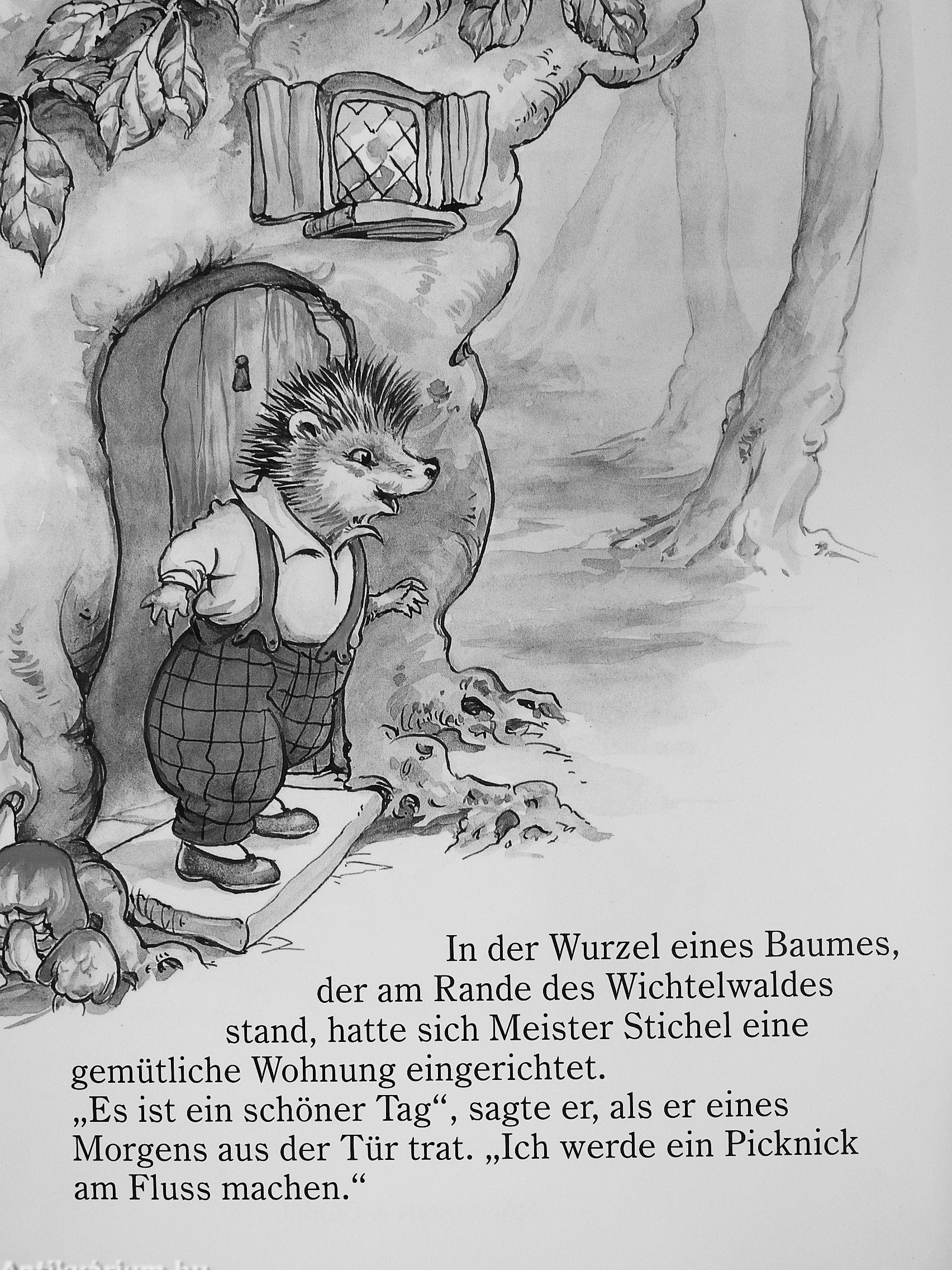 In der Wurzel eines Baumes, der am Rande des Wichtelwaldes stand, hatte sich Meister ¦ |i Stichel eine gemütliche Wohnung eingerichtet. „Es ist ein schöner Tag", sagte er, als er !l] eines Morgens aus der Tür trat. „Ich werde ein Picknick am Fluss machen." Er packte f;; etwas Brot und Käse, einige Kekse und eine Orange ein - so als würde er ahnen, welche Abenteuer ihm an diesem Tag noch bevorstanden.