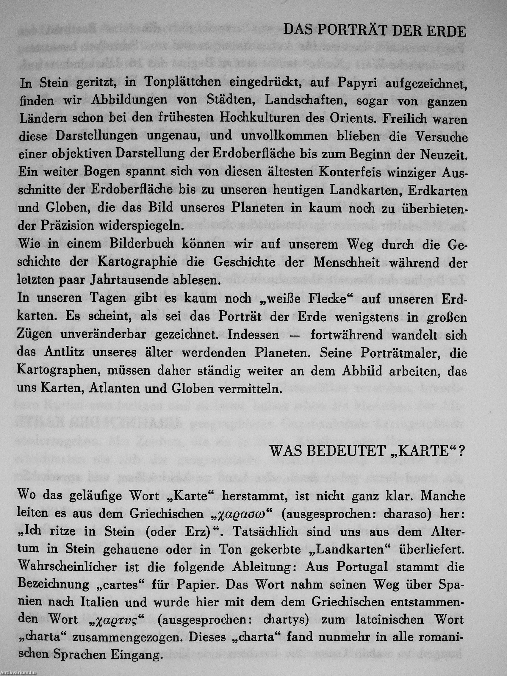 Die Geschichte der Kartographie von den Tontäfelchen der Babylonier bis zu den Funkbildern moderner Satelliten ist zugleich eine Geschichte der zivilisierten Menschheit, sie spiegelt die Eroberung der Erde durch den Menschen.