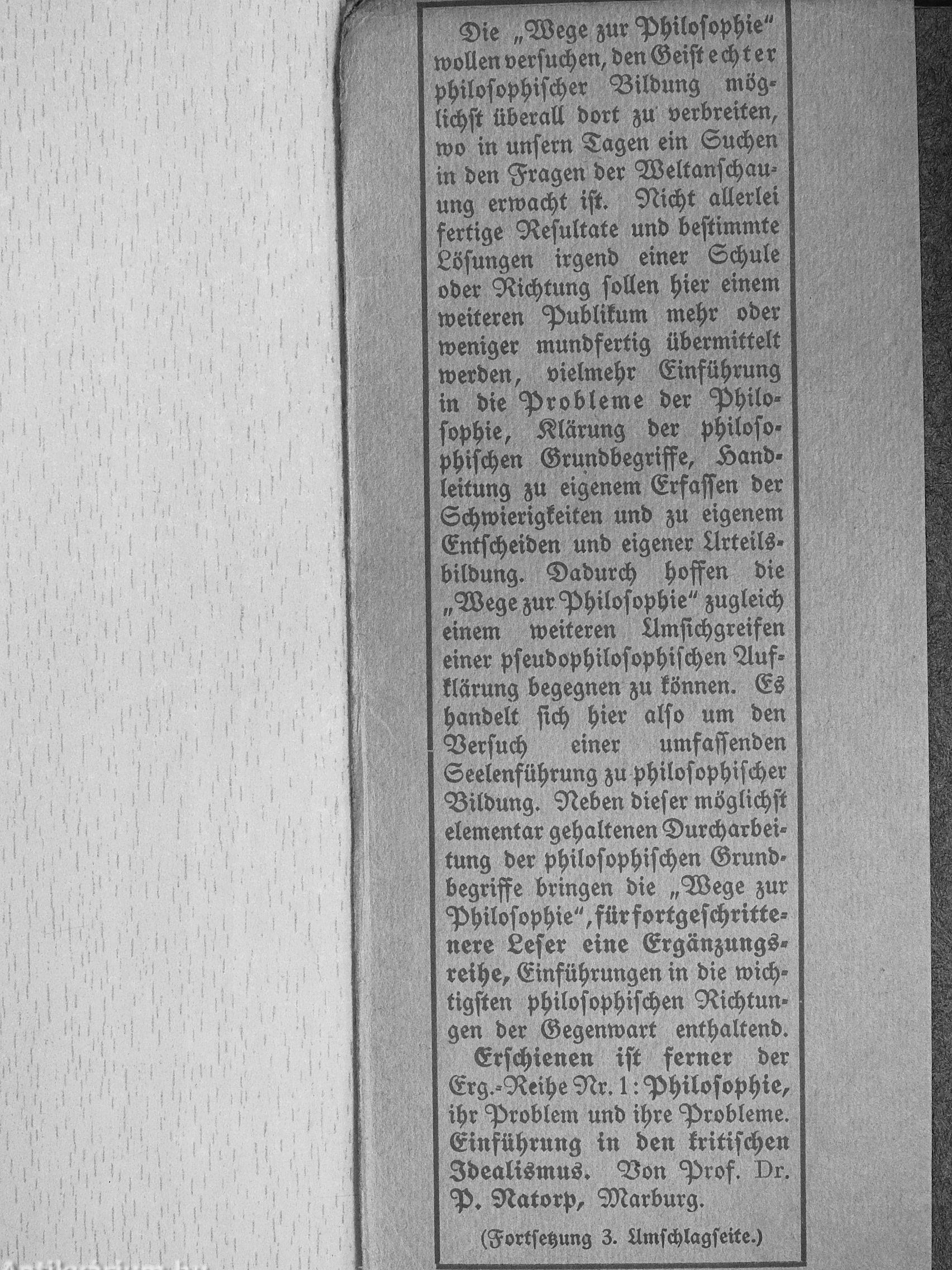fcríige 9íefultatc unb befíimmte ßöfungcn irgenb einer 6^ute ober 9íi(^fung folien ^icr einem »eiteren 'ipubUfum me^r ober weniger munbferíig übermifíelí werben, oietme^r Sinfü^rung in bic 'pro&temc ber 'ip^iío-fop^ie, 5?{ärung ber ))^ilofo-pííifc^cn ©runbbegriffe, ioanb-ictíung ju eigenem (Srfaffen bcr ©c^wierigfeitcn unb ju eigenem ®ntf(^eibcn unb eigener Hrteilá-Htbung. ®aburd^ |>offcn bie „*2Begc5ur^^ilofopí>ie" jugtcií^ einem weiteren tlmjtd^grcifen einer |)feubopí>ilofopí)if(^cn '2luf-fiärung begegnen p ítinnen. í)anbclt jxc^ ^ier otfo um ben 93erfuc^ einer umfaffenben Geelenfü^rung ju )j^ilofopí>ifc^cr ^iíbung. 9ícf)en biefer mögli(^fi elementar geí>attcnen ©urc^arbei-fung bcr pí>ilofo))í>if^cn ©runb-begriffe bringen bic „'2öcgc jur '=P>^itofo)>^ic",fürfotígcfc^t;iííe» ttcre Lefer cinc erganjungé» rcii^c, ®infüí>rnngen in bie wic^-figftcn ))í>ilofot)^if(j^cn Q^ií^fun« gen bcr ©egcnwort cnt^altcnb.