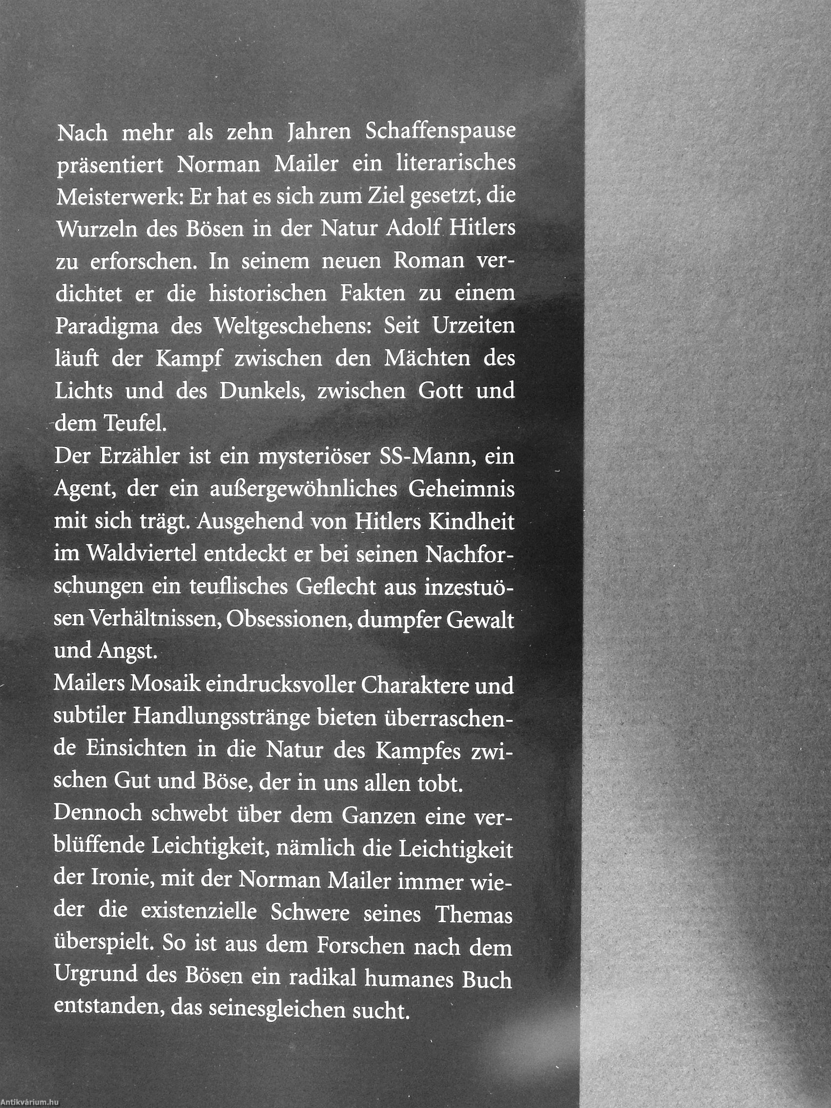 Nach mehr als zehn Jahren Schaffenspause präsentiert Norman Mailer ein literarisches Meisterwerk: Er hat es sich zum Ziel gesetzt, die Wurzeln des Bösen in der Natur Adolf Hitlers zu erforschen. In seinem neuen Roman verdichtet er die historischen Fakten zu einem Paradigma des Weltgeschehens: Seit Urzeiten läuft der Kampf zwischen den Mächten des Lichts und des Dunkels, zwischen Gott und dem Teufel.