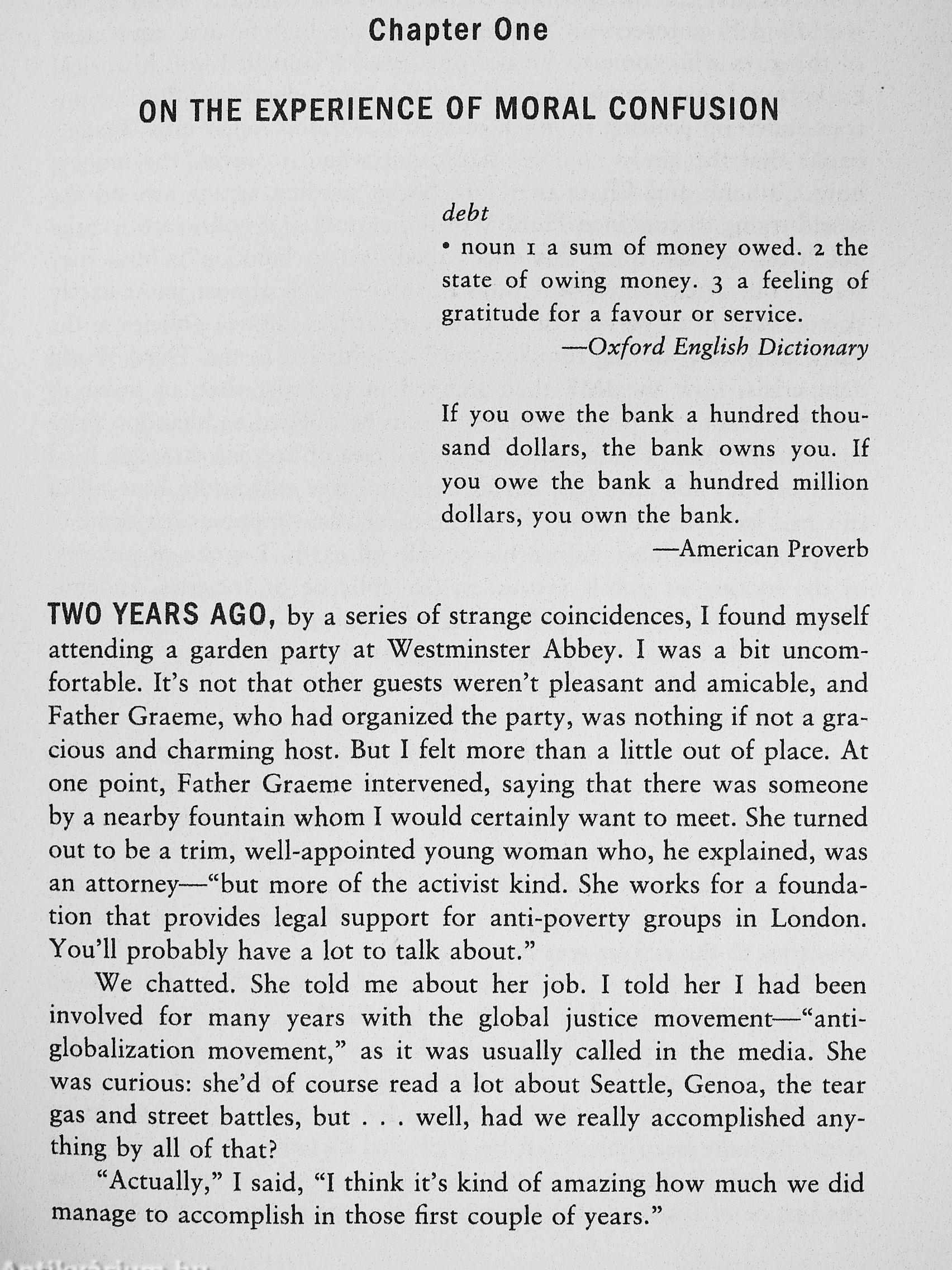 ^ver since, arguments about debt and debt forgiveness have been at the cenfter of political debates from Italy to China, and have sparked innumerable insurrections. Indeed, the language of the ancient works of law and religion (words like "guilt," "sin," and "redemption") derive from these ancient and nearly forgot-tendebates about debt, and shape even our most basic ideas of right and wrong. Without knowing it, we are still fighting these battles today.