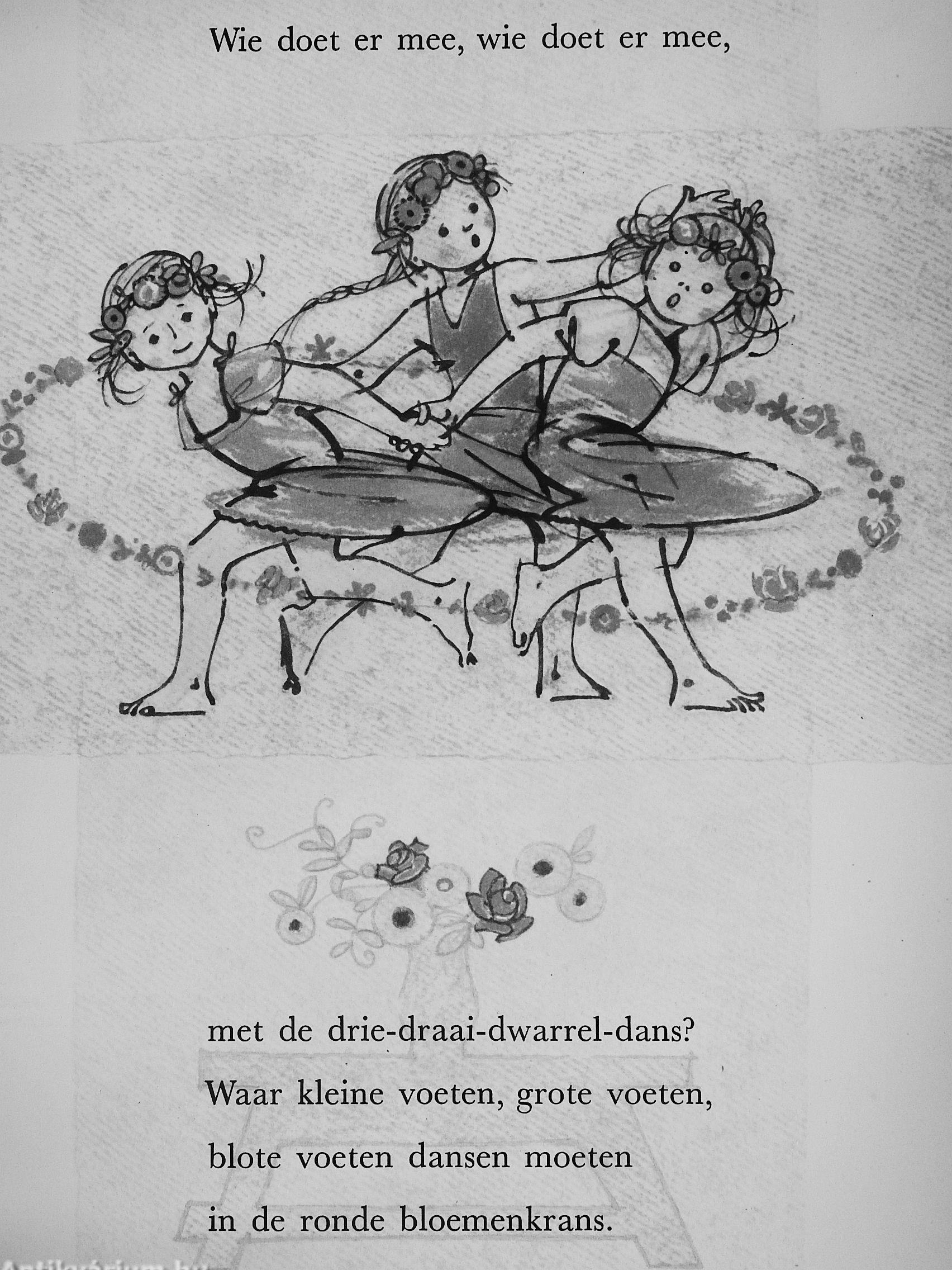 fVie doet er mee, wie doet er mee, met de drie-draai-dwarrel-dans? Waat kleine voeten, grote voeíeriy bíote voeten dansen moeten in de ronde bloemenkrans.