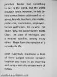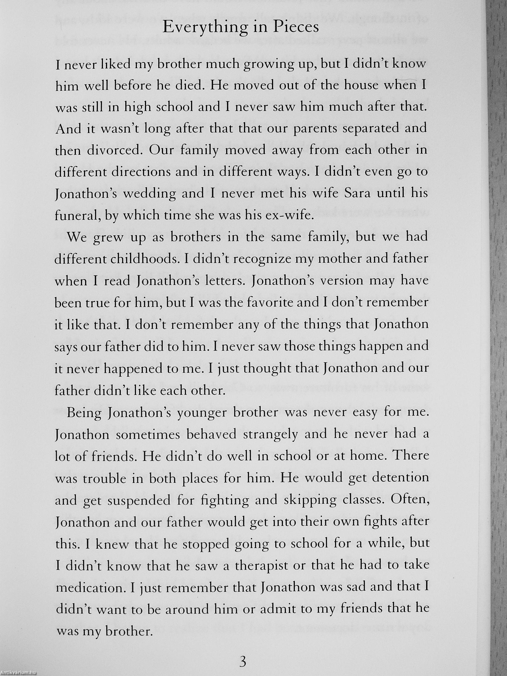 Jonathon Bender had something to say to the world, but the world wouldn't listen. However, he left behind unsent letters addressed to relatives, friends, teachers, classmates, professors, roommates, employers, former girlfriends, his ex-wife, the Tooth Fairy, the Easter Bunny, Santa Claus, the state of Michigan, and a weather satellite, among many others. These form the narrative of a remarkable life.