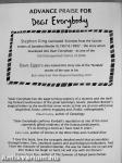 "Dear Everybody has the page-turning urgency of a mystery and the thrilling formal inventiveness of the great epistol^iry novels. Jonathon Bender's magical letters to the world that never wrote to him are at once whimsical, anguished, funny, utterly engaging and, finally, unforgettable."