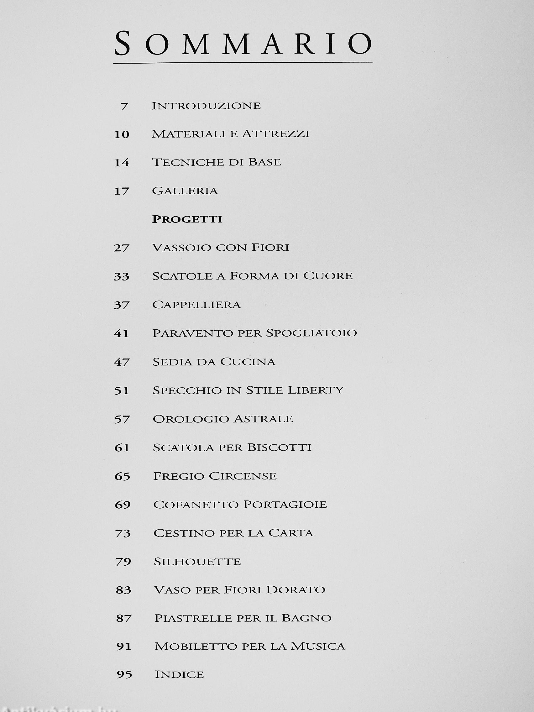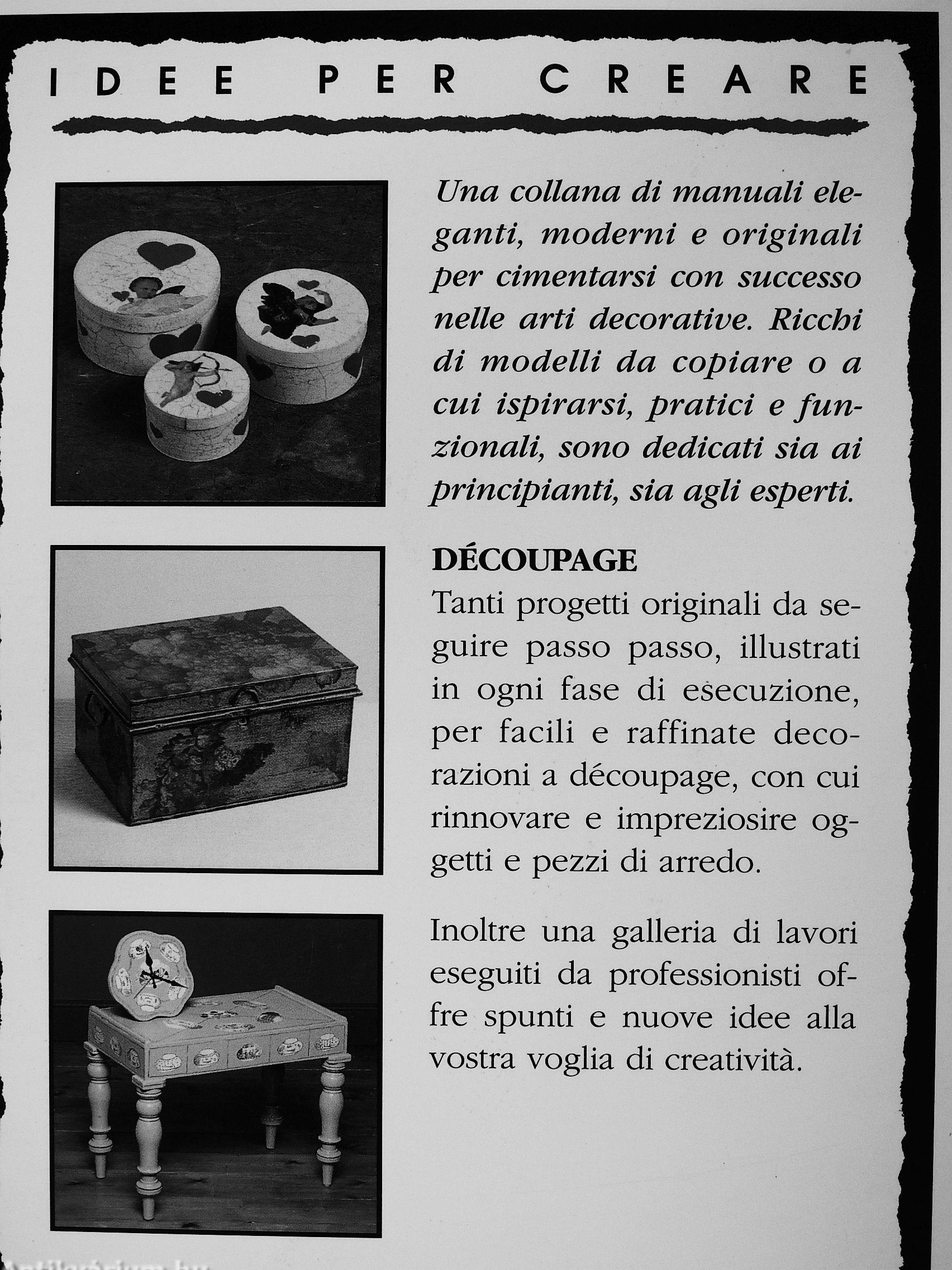 Tanti progetti originali da seguiré passo passo, illustrati in ogni fase di esecuzione, per facili e raffinate deco-razioni a découpage, con cui rinnovare e impreziosire og-getti e pezzi di arredo.