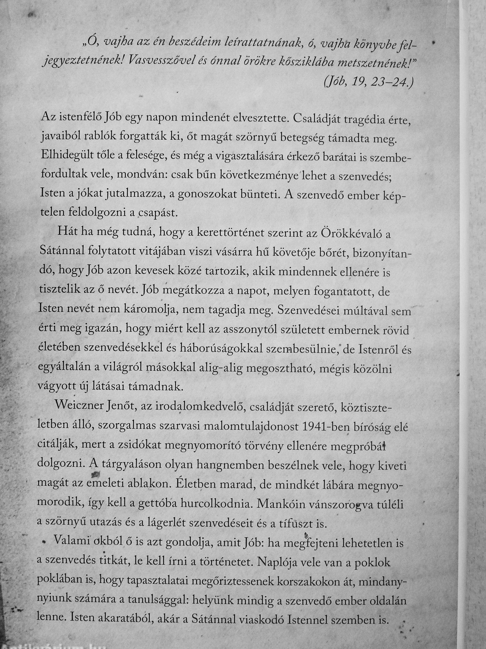 . Valami okból ő is azt gondolja, amit Jób: ha megfejteni lehetetlen is a szenvedés titkát, le kell írni a történetet. Naplója vele van a poklok poklában is, hogy tapasztalatai megőriztessenek korszakokon át, mindany-nyiunk számára a tanulsággal: helyünk mindig a szenvedő ember oldalán lenne. Isten akaratából, akár a Sátánnal viaskodó Istennel szemben is. •