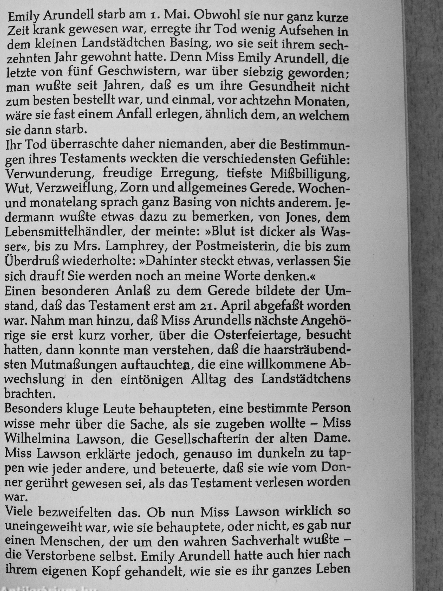 Wenn Poirot auf seinen Freund Hastings gehört hätte, wäre Miss Arundells Brief in den Papierkorb gewandert. Doch eine Kleinigkeit macht ihn stutzig. Er eilt zu seiner neuen Klientin und findet nur noch die Hinterbliebenen vor. Der Hund trauert seiner toten Herrin, die Familie der entgangenen Erbschaft nach. Beides ist zwar verständlich, vieles aber bleibt rätselhaft