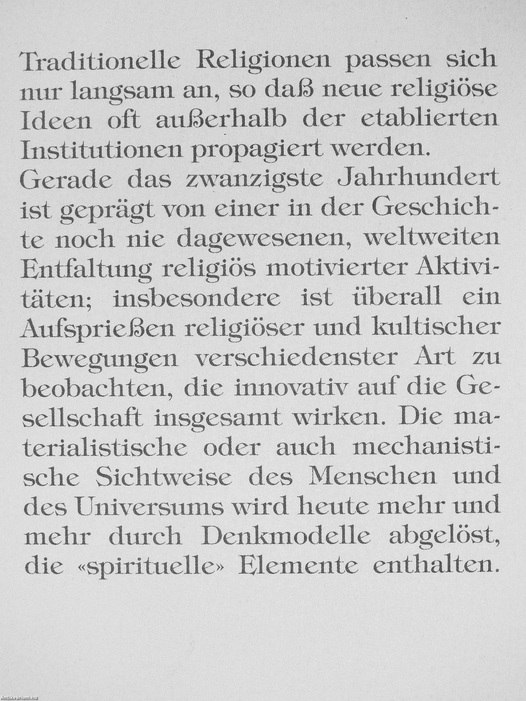 Traditionelle Religionen passen sich nin^ langsam an, so daß neue religi()se Ideen oft außerlialb der etablierten Institutionen propagiert werden. Gerade das zwanzigste Jalirliinidert ist geprägt von einer in der Geseliicli-te noch nie dagewesenen, weltweiten Entfaltung religiös motivierter AMivi-täten; insbesondere ist überall ein Aufsprießen religiöser und kultischer Bewegimgen verscliiedenster Art zu beobachten, die innovativ auf die Gesellschaft insgesamt wirken. Die nia-terialistische oder auch meclianisti-sclie Sichtweise des Menschen und des IJniversiuns \vird heute mehr tmd mehr dtu'ch Denloiiodelle abgelöst, die «spiritxtelle» Elemente enthalten.