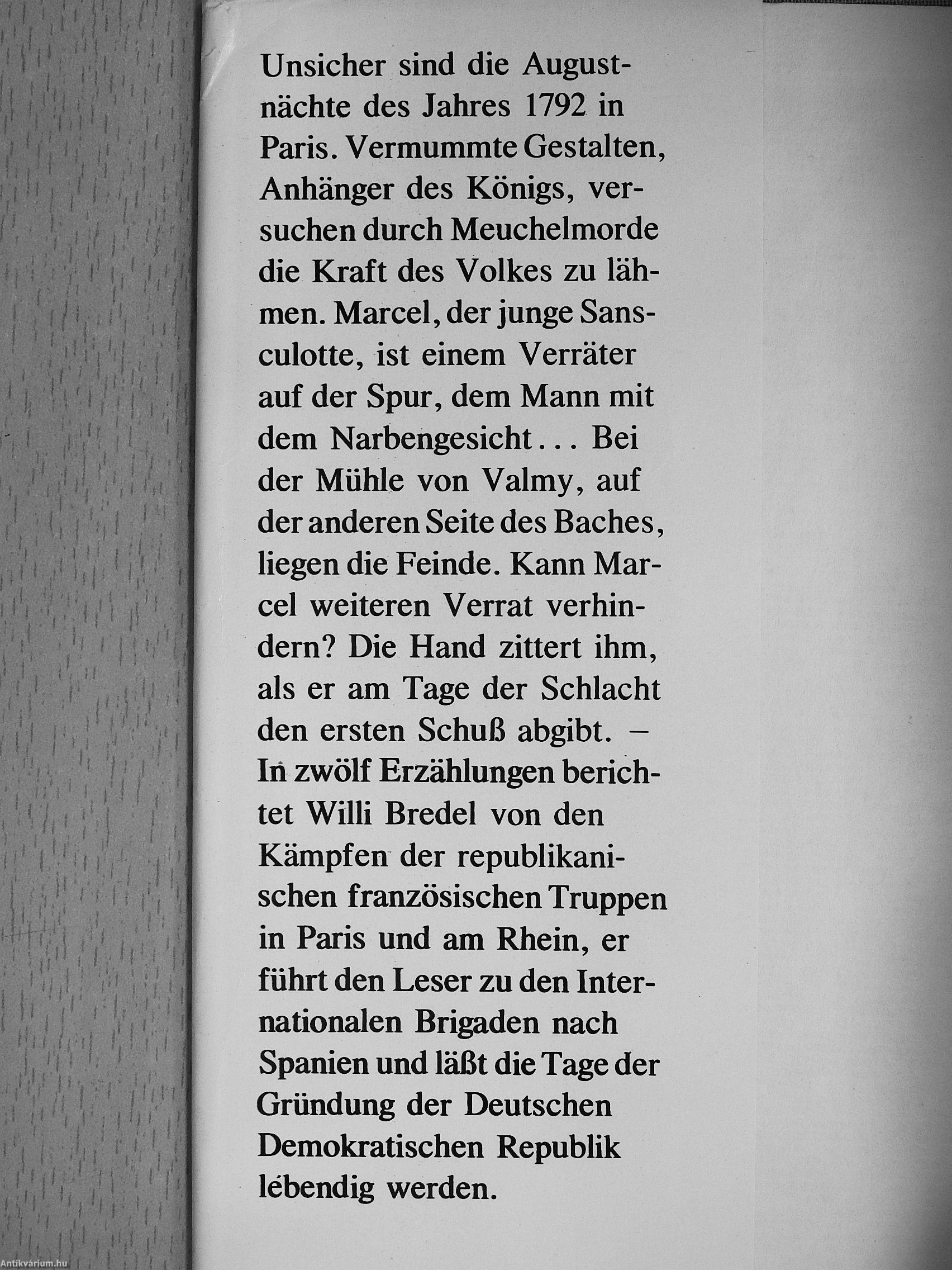Unsicher sind die Augustnächte des Jahres 1792 in Paris. Vermummte Gestalten, Anhänger des Königs, versuchen durch Meuchelmorde die Kraft des Volkes zu lähmen. Marcel, der junge Sansculotte, ist einem Verräter auf der Spur, dem Mann mit dem Narbengesicht Bei der Mühle von Valmy, auf der anderen Seite des Baches, liegen die Feinde. Kann Marcel weiteren Verrat verhindern? Die Hand zittert ihm, als er am Tage der Schlacht den ersten Schuß abgibt. -Iii zwölf Erzählungen berichtet Willi Bredel von den Kämpfen der republikanischen französischen Truppen in Paris und am Rhein, er führt den Leser zu den Internationalen Brigaden nach Spanien und läßt die Tage der Gründung der Deutschen Demokratischen Republik lebendig werden. Vissza