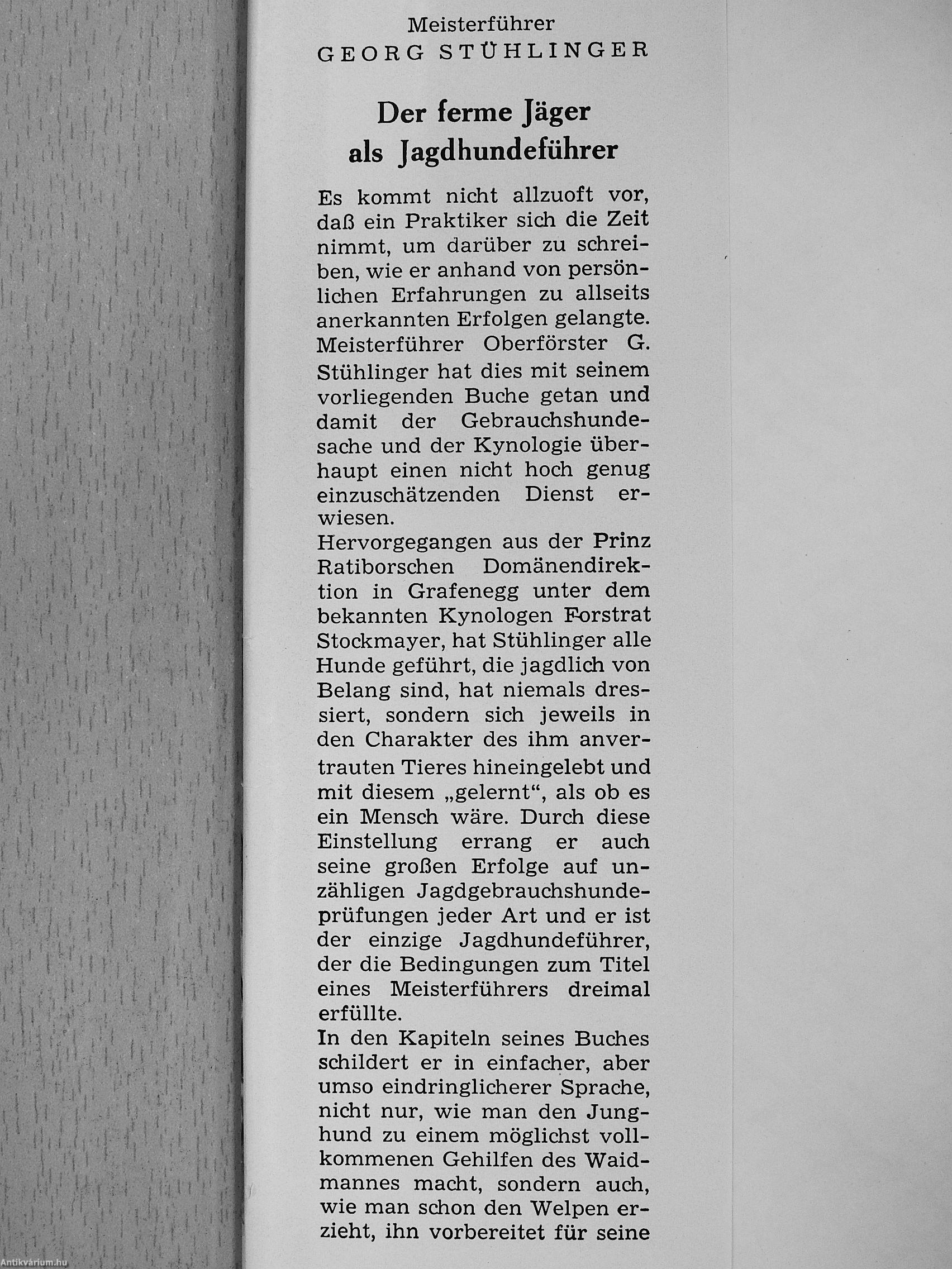 Es kommt nicht allzuoft vor, daß ein Praktiker sich die Zeit nimmt, um darüber zu schreiben, wie er anhand von persönlichen Erfahrungen zu allseits anerkannten Erfolgen gelangte. Meisterführer Oberförster G. Stühlinger hat dies mit seinem vorliegenden Buche getan und damit der Gebrauchshundesache und der Kynologie überhaupt einen nicht hoch genug einzuschätzenden Dienst erwiesen.