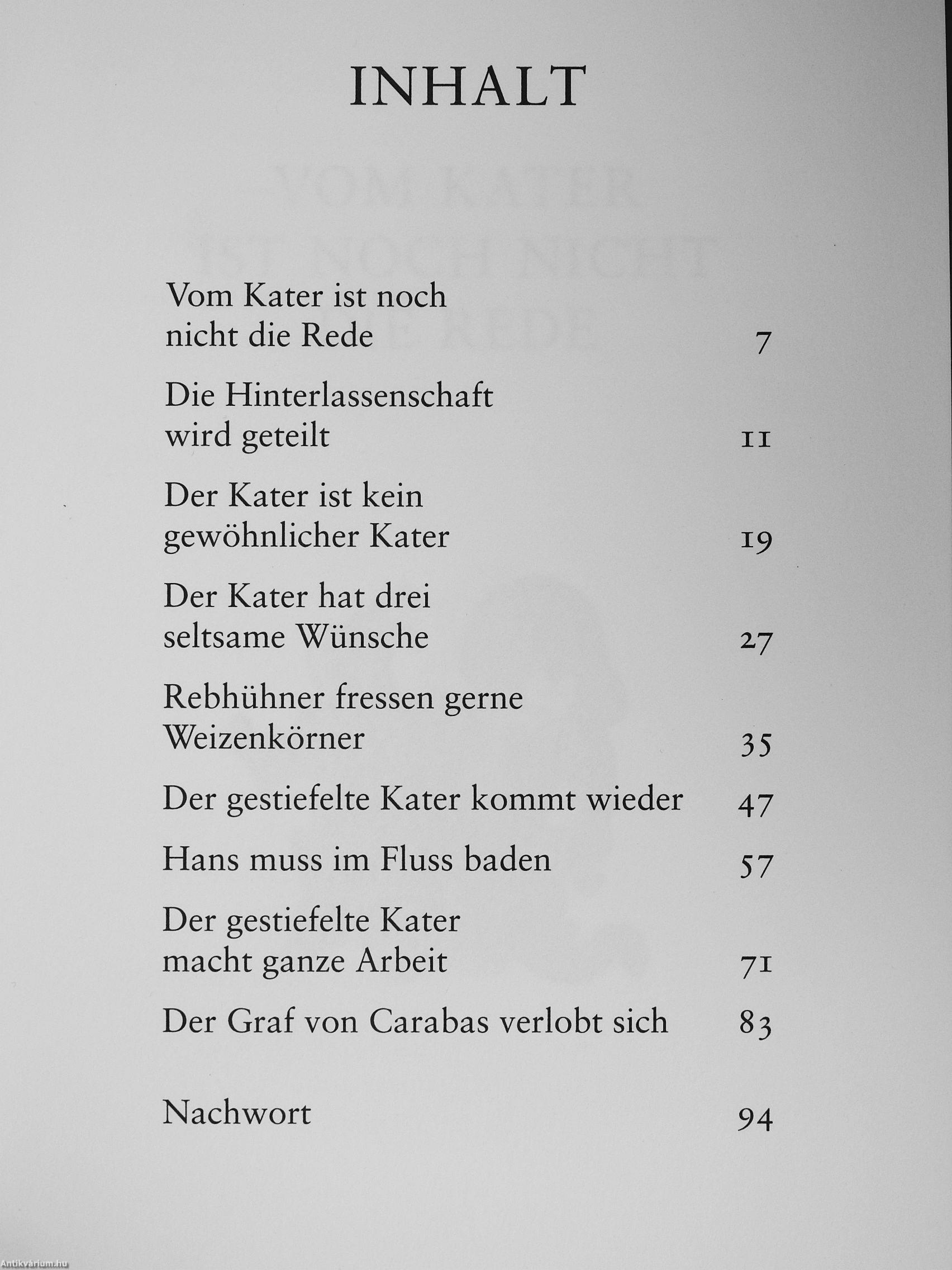 Nichts bleibt dem jüngsten Müllerssohn, als der Vater gestorben isi, nichts aufeer dem Kater. Und wie soll der ihm schon hellen? Obwohl, ein besonderer Kaier ist er ja: Er spricht lind scheint so seine eigenen Vorstellungen davon zu haben, was zu tun ist. Aber dazu brauclii er erst einmal eine kleine grüne Jagdtasche, einen Sack und ein paar hohe Siiefel
