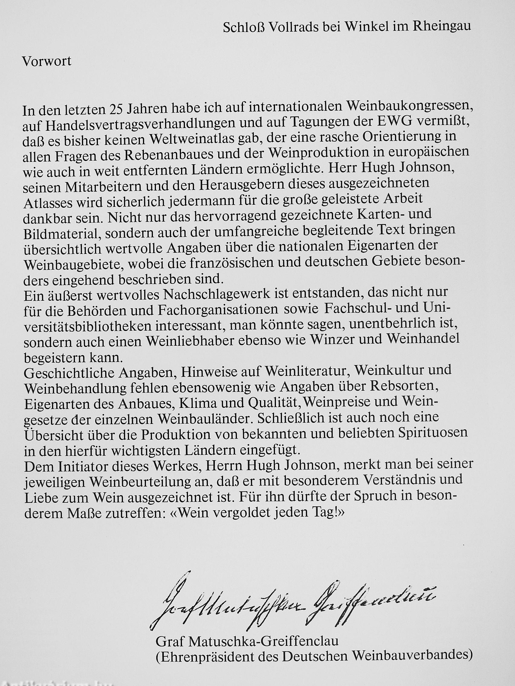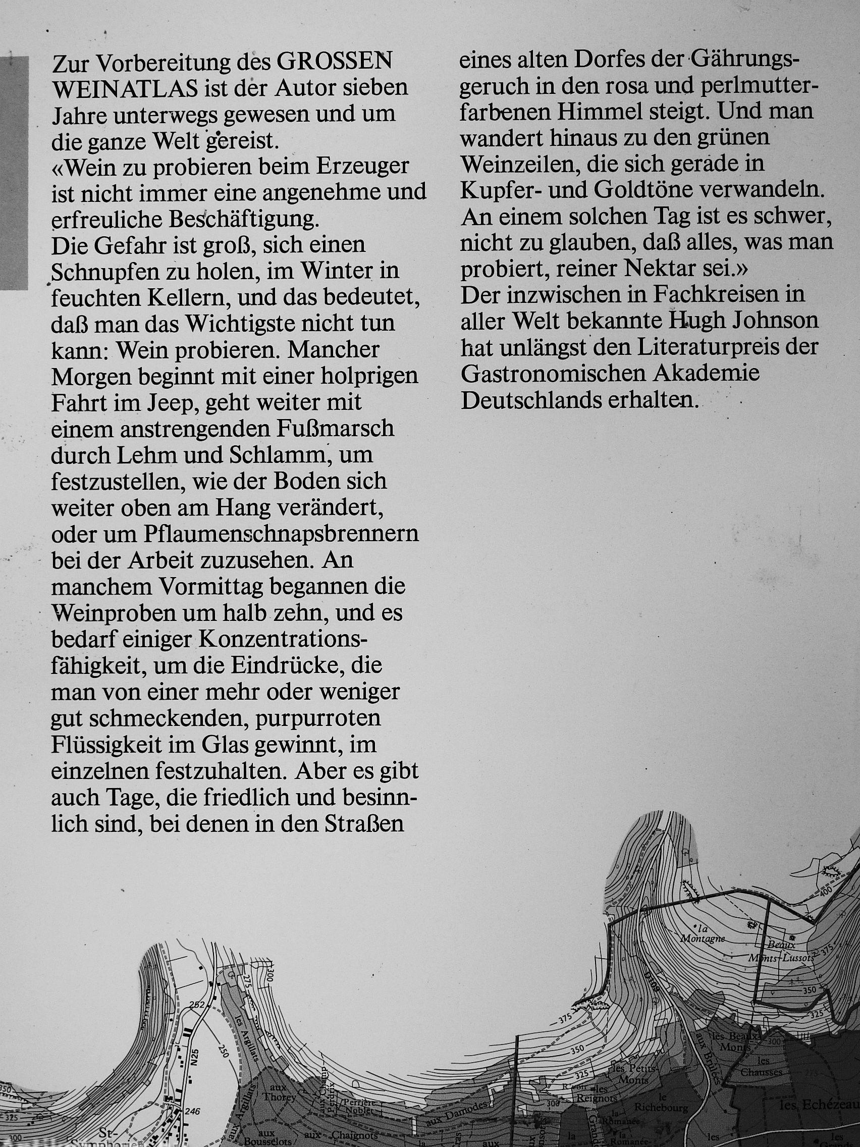 eines alten Dorfes der Gährungs-geruch in den rosa und perlmutter-farbenen Himmel steigt. Und man wandert hinaus zu den grünen Weinzeilen, die sich gerade in Kupfer- und Goldtöne verwandebi. An einem solchen Tag ist es schwer, nicht zu glauben, daß alles, was man probiert, reiner Nektar sei.» Der inzwischen in Fachkreisen in aller Welt bekannte Hugh Johnson hat unlängst den Literaturpreis der Gastronomischen Akademie Deutschlands erhalten.