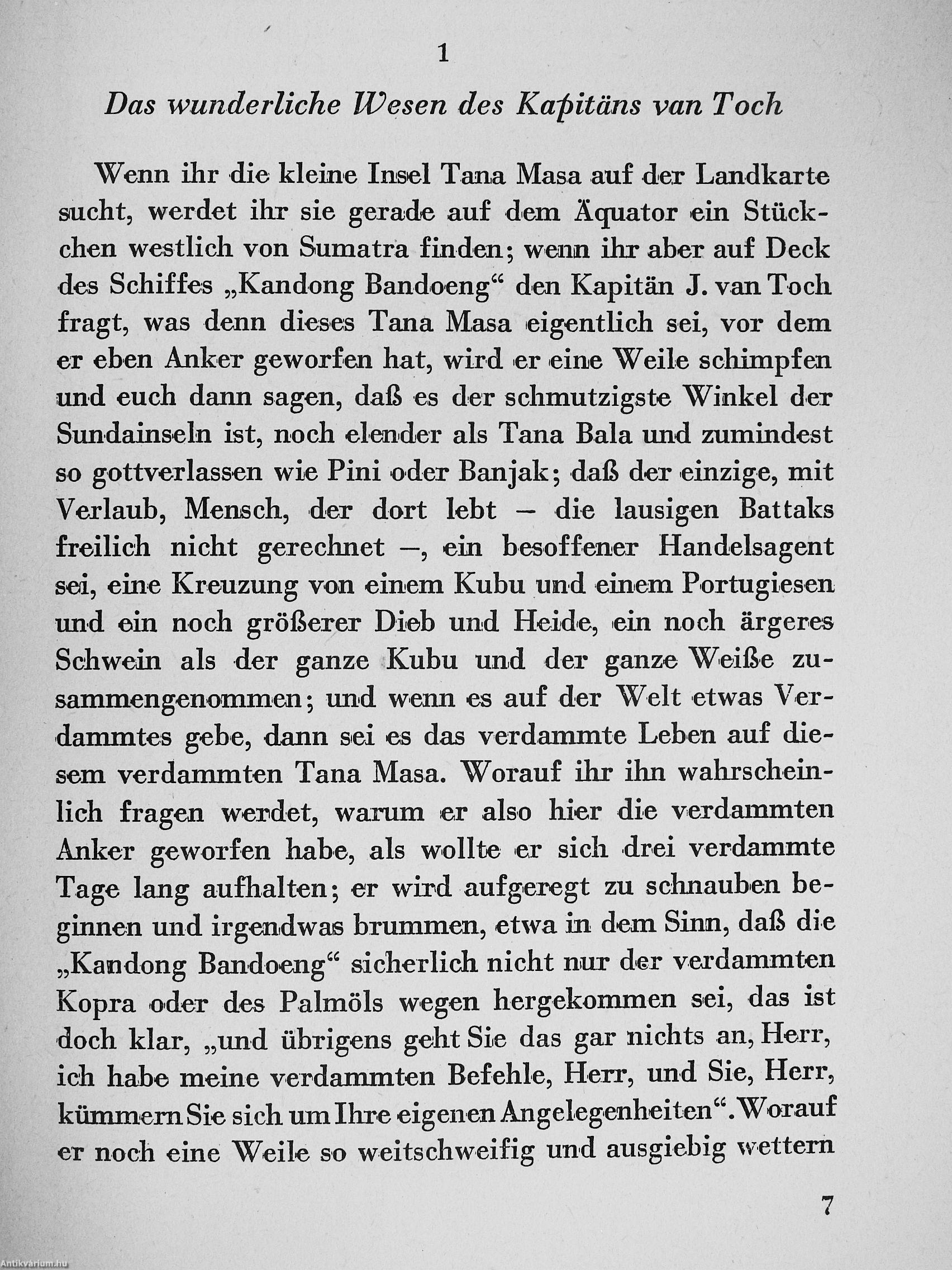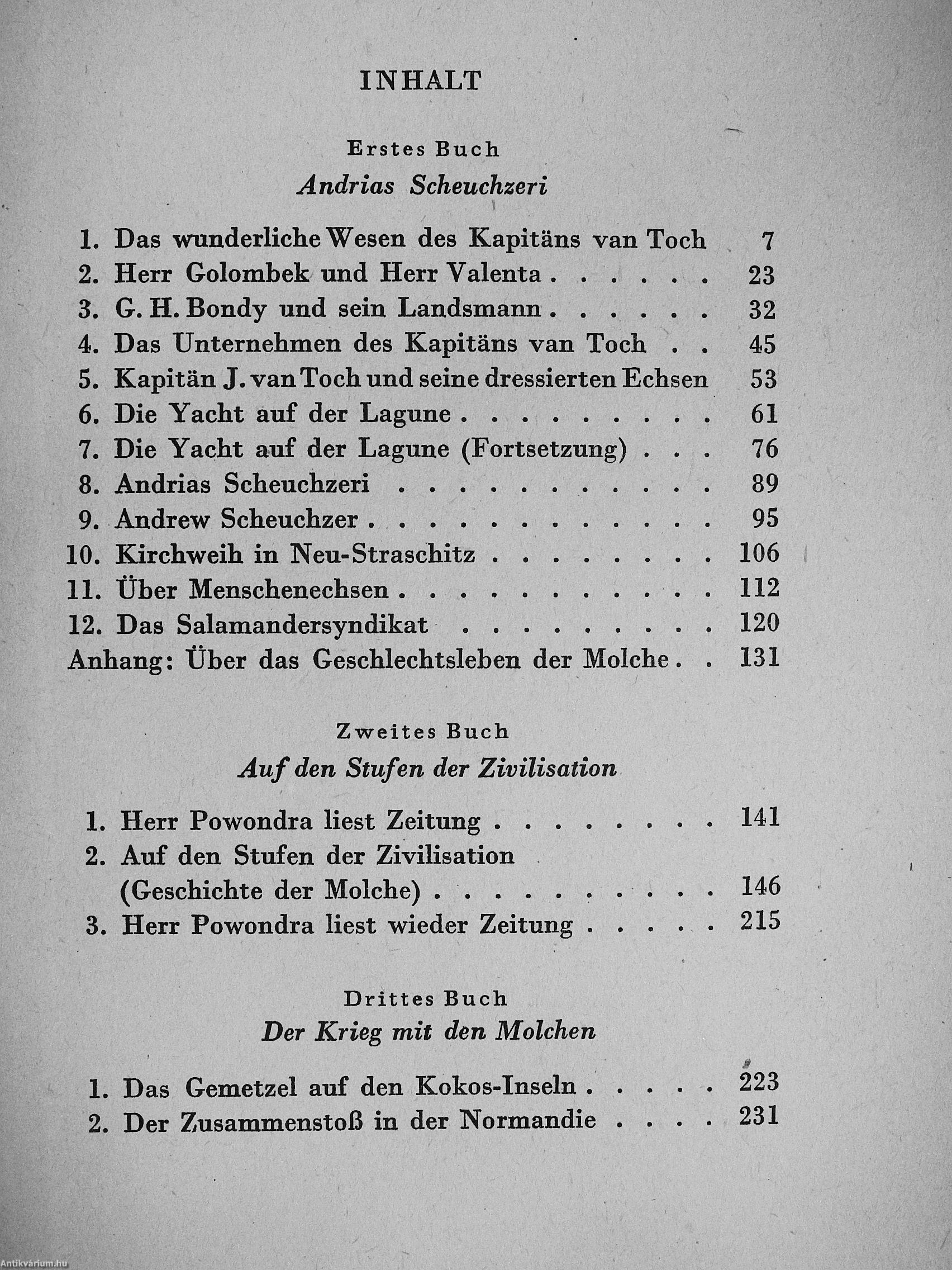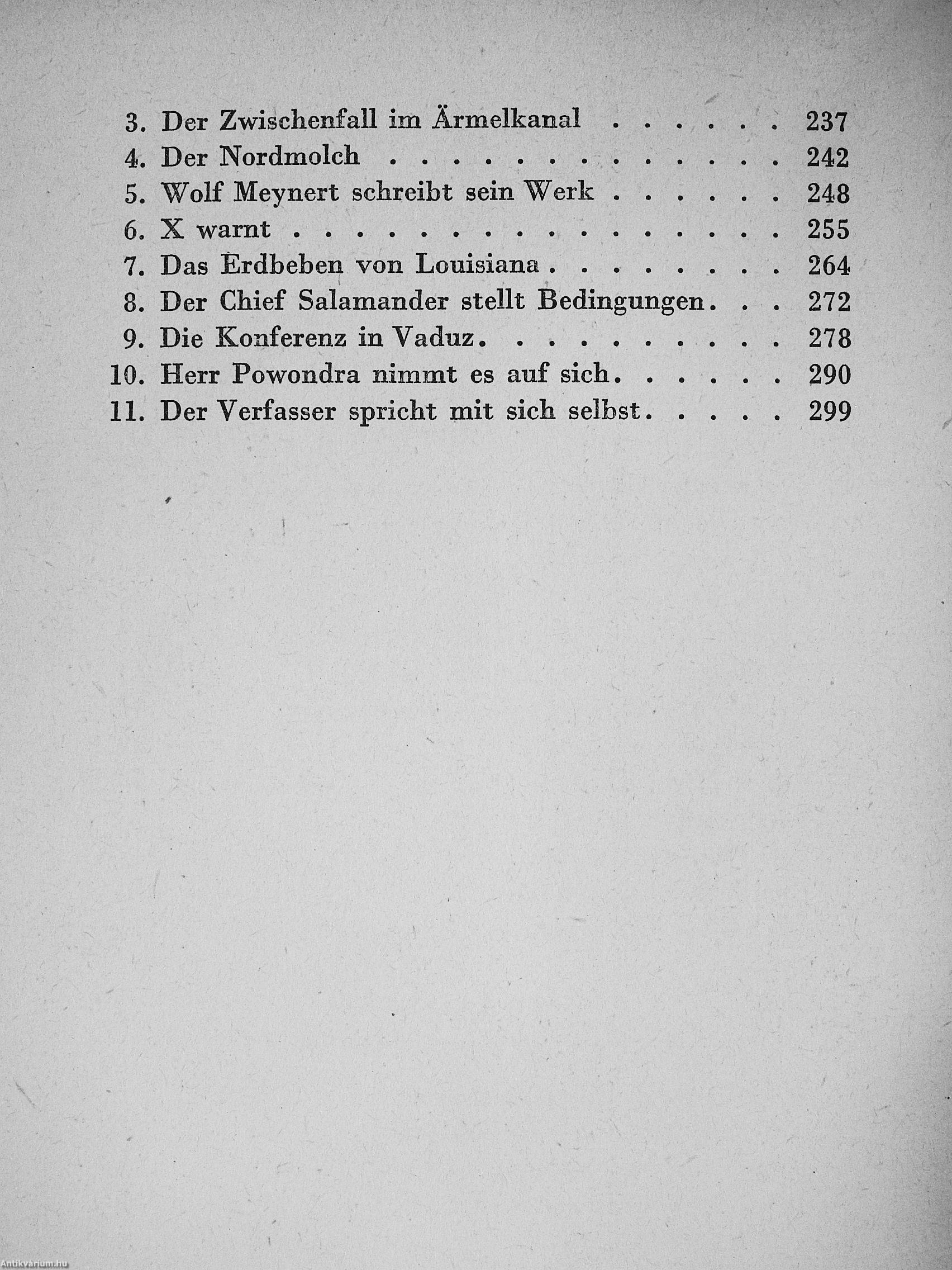 Kapitän van Toch macht eine merkwürdige Entdeckung. Er findet im Inselgebiet von Sumatra eine besondere Art von Molchen, die sich zum Perlenfischen, Dammbauen und zu ähnlichen Arbeiten abrichtcn läßt. Tüchtige Manager wittern ein Riesengeschäft. Ein gigantisches „Salamandersyndikat" entstellt, Filmgesellschaften, Zeitungen imd Rundfunk leben nur noch von den seltsamen Wmider-tieren, 4ie sogar sprechen lernen. Nicht lange und die Seestaaten England, Frankreich imd Italien beginnen, billige Arbeitsarmeen und bewaffnete Molchdivisionen aufzustellen. Deutschland dagegen fordert Raum für seine nordisch-langschädligen Edelsalamander preußischer Erziehung. Die Welt gerät in einen Taumel, das Molchzeitalter scheint angebrochen. Aber bald sind diese Tiere so zahlreich imd haben so viel gelernt, daß sie den Spieß lundrehen und ihre einstigen Herren bedrohen. Sie schik-ken sich an, überall das Land abzutragen, um neue Wassergebiete zu schaffen, imd...