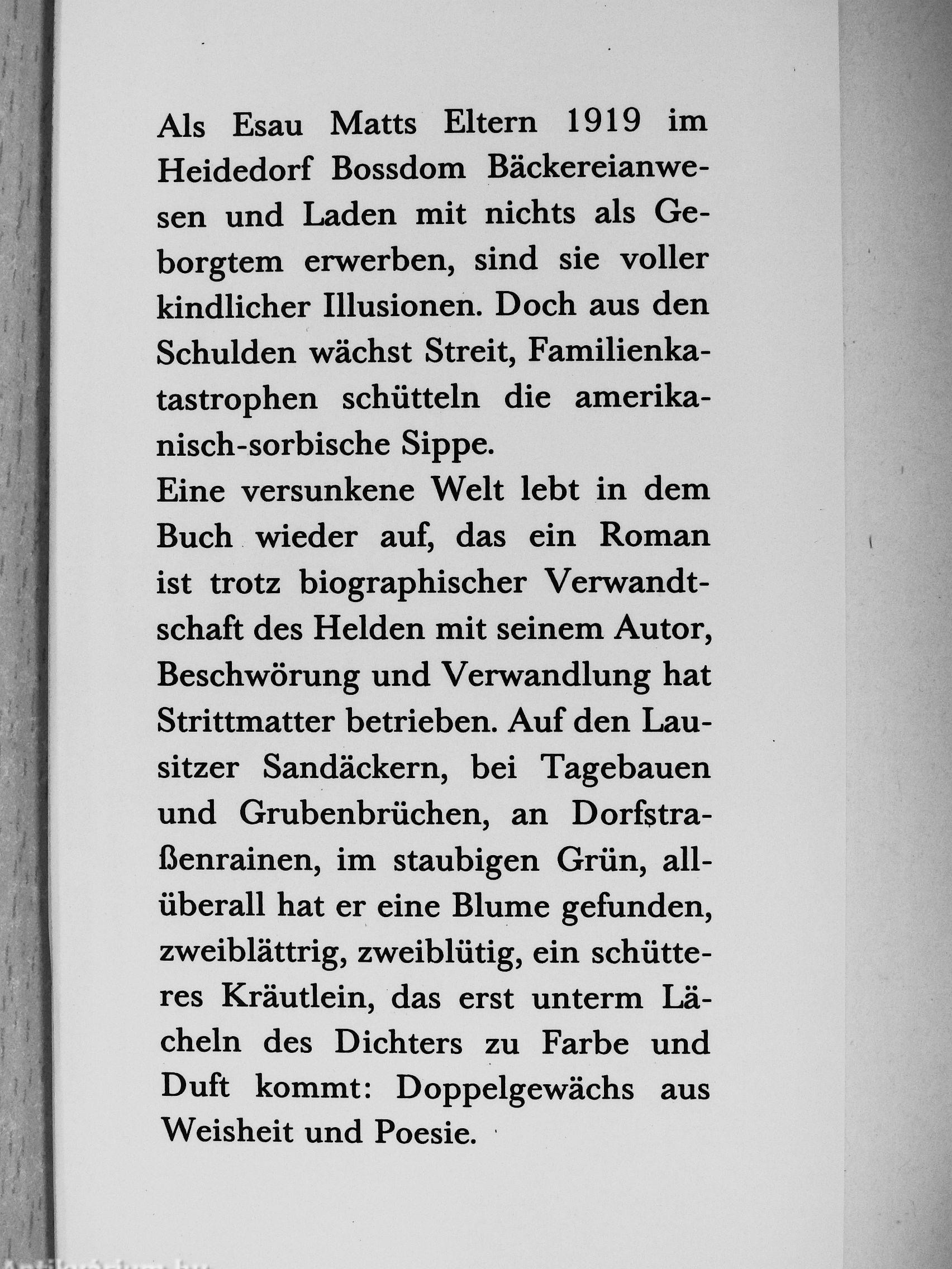 Als Esau Matts Eltern 1919 im Heidedorf Bossdom Bäckereianwesen und Laden mit nichts als Geborgtem erwerben, sind sie voller kindlicher Illusionen. Doch aus den Schulden wächst Streit, Familienkatastrophen schütteln die amerikanisch-sorbische Sippe. Eine versunkene Welt lebt in dem Buch wieder auf, das ein Roman ist trotz biographischer Verwandtschaft des Helden mit seinem Autor, Beschwörung und Verwandlung hat Strittmatter betrieben. Auf den Lausitzer Sandäckern, bei Tagebauen und Grubenbrüchen, an Dorfstraßenrainen, im staubigen Grün, allüberall hat er eine Blume gefunden, zweiblättrig, zweiblütig, ein schütteres Kräutlein, das erst unterm Lächeln des Dichters zu Farbe und Duft kommt: Doppelgewächs aus Weisheit und Poesie.