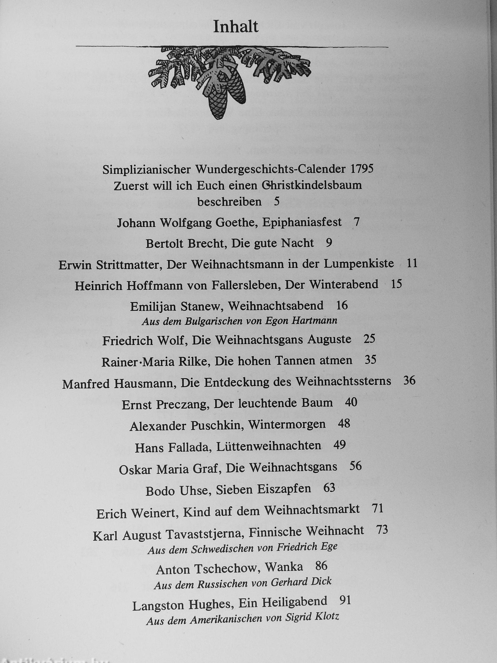Das ist auch die Botschaft der anderen Weihnachtserzählungen in dieser Sammlung: Achtet aufeinander, tragt Sorge, daß keinem ein Unrecht geschieht, macht diese Erde zu einer guten Heimat für die Menschen! Dichter aus aller Welt, zum Beispiel Hans Christian Andersen, Oskar Maria Graf, Bret Harte, Erich Kästner, Ejnar Mikkelsen, Marcel Pagnol, Alexander Puschkin, Theodor Storm und Anton Tschechow, haben heitere und ernste Geschichten und Gedichte über ihre weihnachtlichen Erlebnisse und Beobachtungen geschrieben. So kehrt Felix, vor Jahren zum Einholen geschickt und seither verschollen, am Weihnachtsabend zu Vater und Mutter zurück. In der Familie des Opernsängers Luitpold Löwenhaupt verursacht die Weihnachtsgans Auguste großes Durcheinander; schon gerupft, wird sie neu eingekleidet und verwöhnt. Den kleinen Wanka plagt das Heimweh nach seinem Dorf zu Weihnachten be-