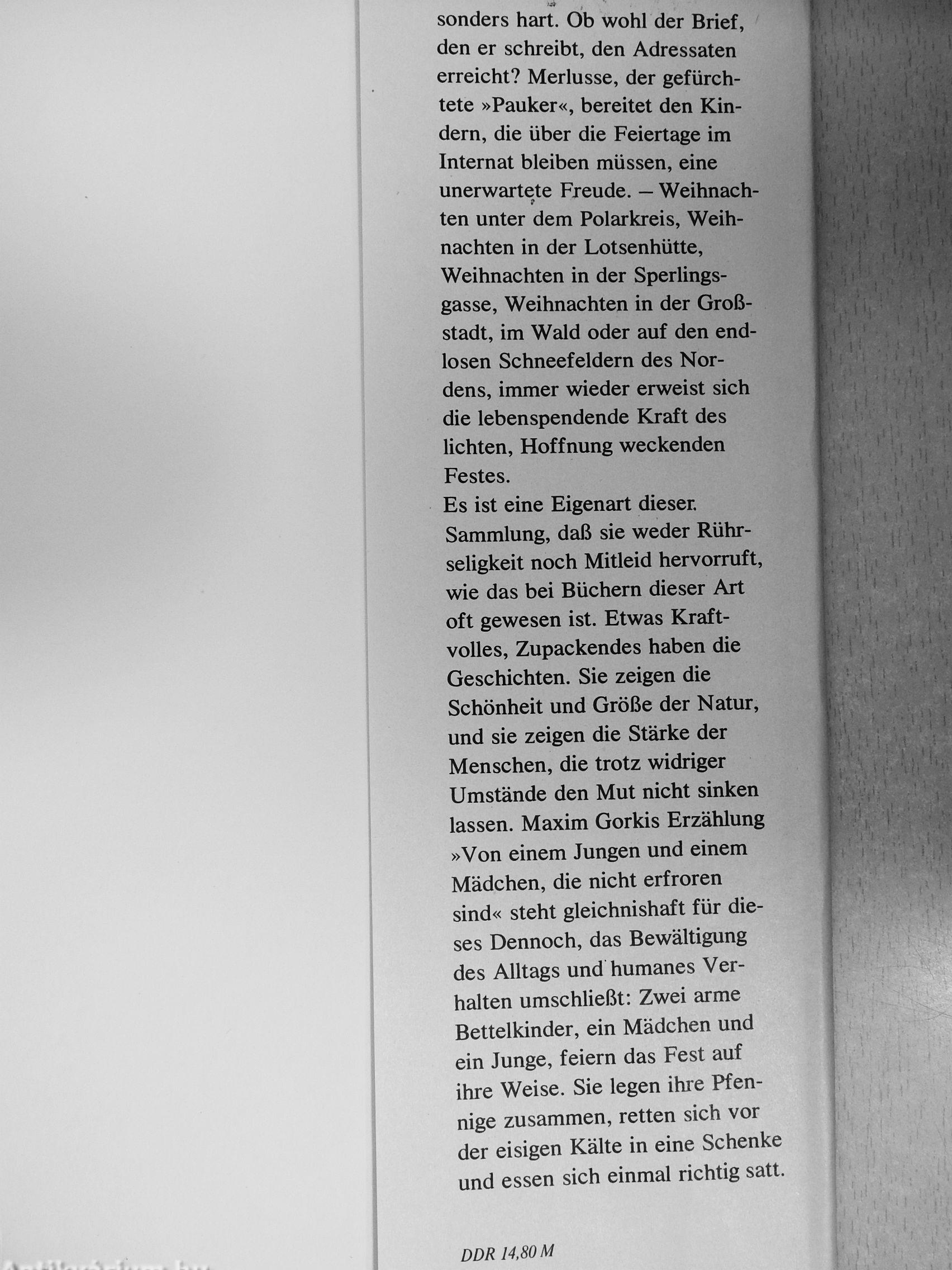 Es ist eine Eigenart dieser. Sammlung, daß sie weder Rührseligkeit noch Mitleid hervorruft, wie das bei Büchern dieser Art oft gewesen ist. Etwas Kraftvolles, Zupackendes haben die Geschichten. Sie zeigen die Schönheit und Größe der Natur, und sie zeigen die Stärke der Menschen, die trotz widriger Umstände den Mut nicht sinken lassen. Maxim Gorkis Erzählung »Von einem Jungen und einem Mädchen, die nicht erfroren sind« steht gleichnishaft für dieses Dennoch, das Bewältigung des Alltags und humanes Verhalten umschließt: Zwei arme Bettelkinder, ein Mädchen und ein Junge, feiern das Fest auf ihre Weise. Sie legen ihre Pfennige zusammen, retten sich vor der eisigen Kälte in eine Schenke und essen sich einmal richtig satt.
