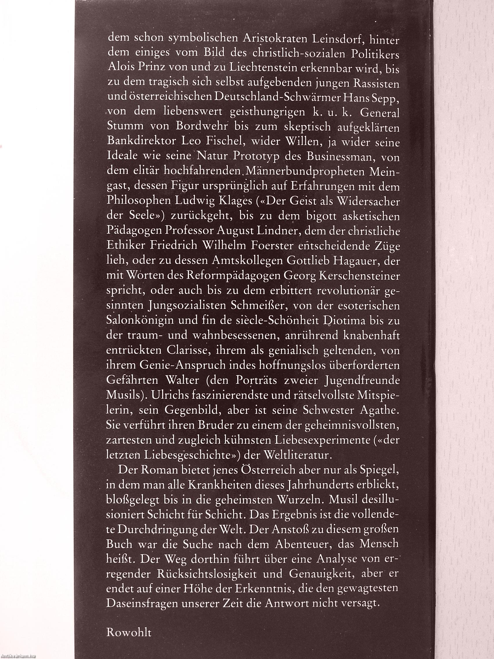 Der Roman bietet jenes Österreich aber nur als Spiegel, in dem man alle Krankheiten dieses Jahrhunderts erblickt, bloßgelegt bis in die geheimsten Wurzeln. Musil desillu-sioniert Schicht für Schicht. Das Ergebnis ist die vollendete Durchdringung der Welt. Der Anstoß zu diesem großen Buch war die Suche nach dem Abenteuer, das Mensch heißt. Der Weg dorthin führt über eine Analyse von erregender Rücksichtslosigkeit und Genauigkeit, aber er endet auf einer Höhe der Erkenntnis, die den gewagtesten Daseinsfragen unserer Zeit die Antwort nicht versagt.