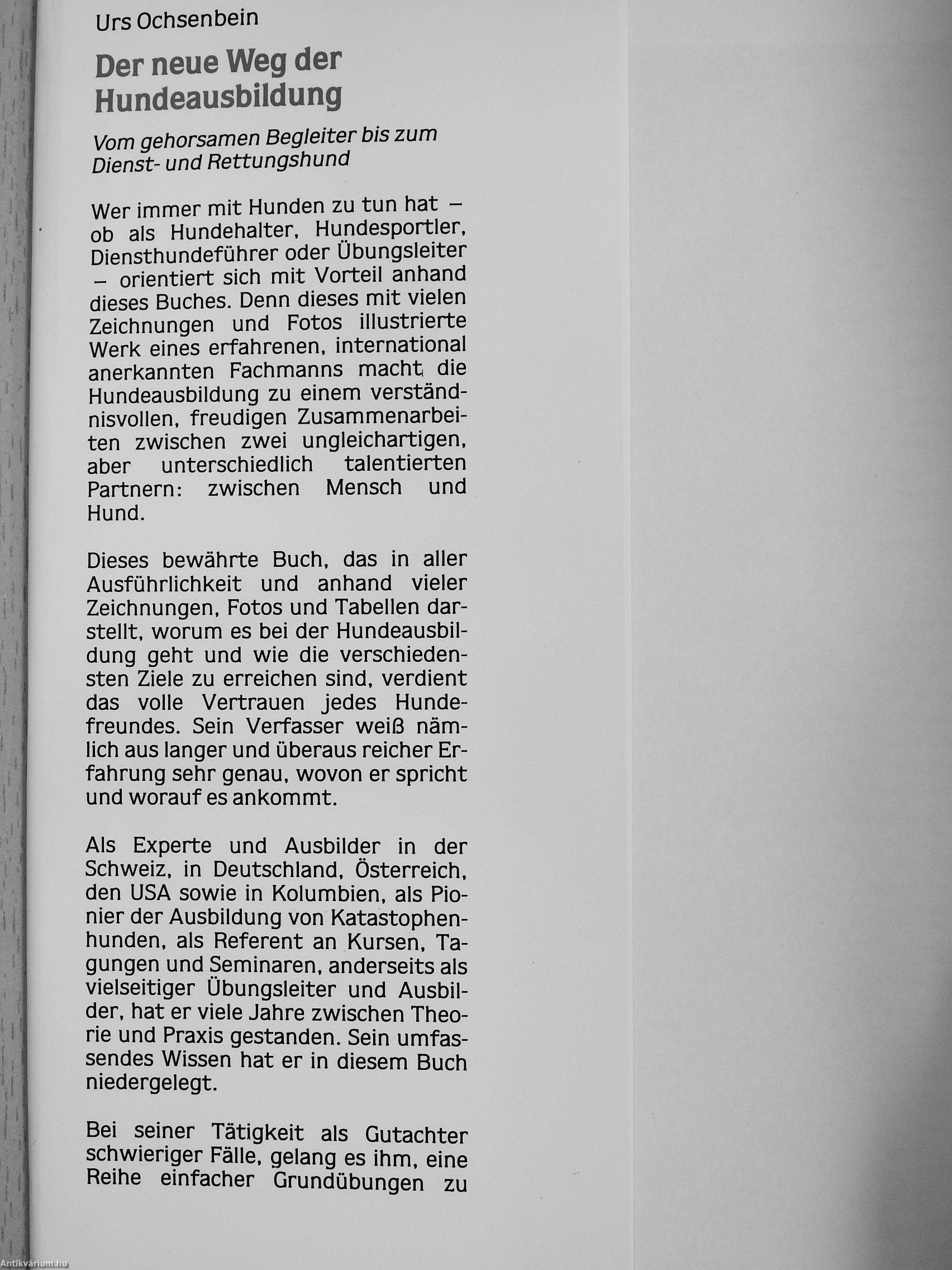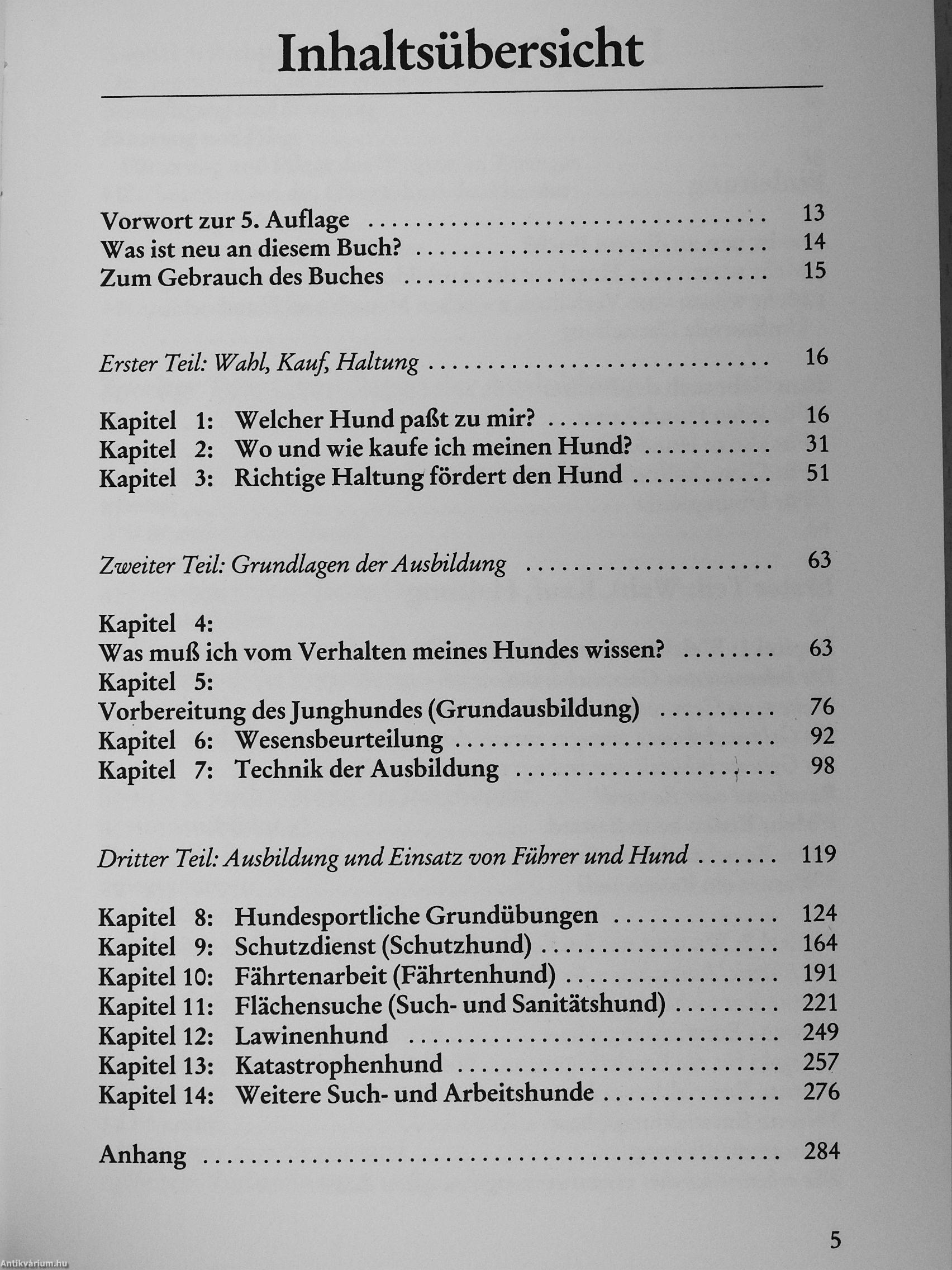 Wer immer mit Hunden zu tun hat -ob als Hundehalter, Hundesportler. Diensthundeführer oder Übungsleiter - orientiert sich mit Vorteil anhand dieses Buches. Denn dieses mit vielen Zeichnungen und Fotos illustrierte Werk eines erfahrenen, international anerkannten Fachmanns macht die Hundeausbildung zu einem verständnisvollen, freudigen Zusammenarbeiten zwischen zwei ungleichartigen, aber unterschiedlich talentierten Partnern: zwischen Mensch und Hund.
