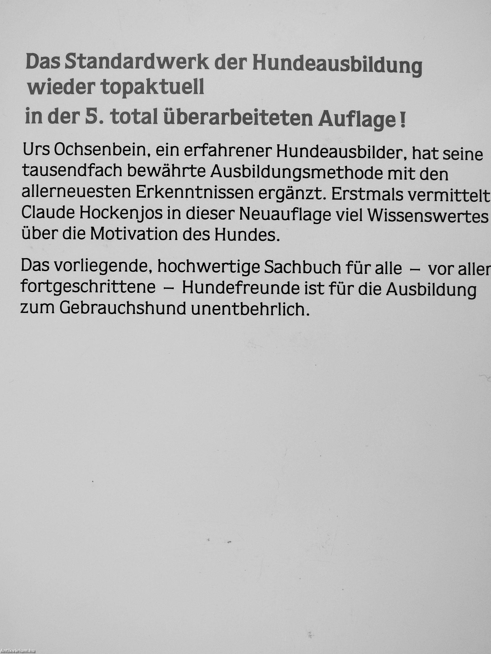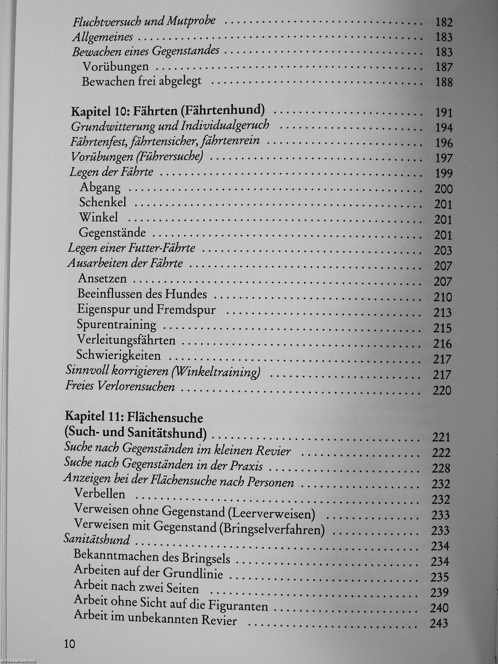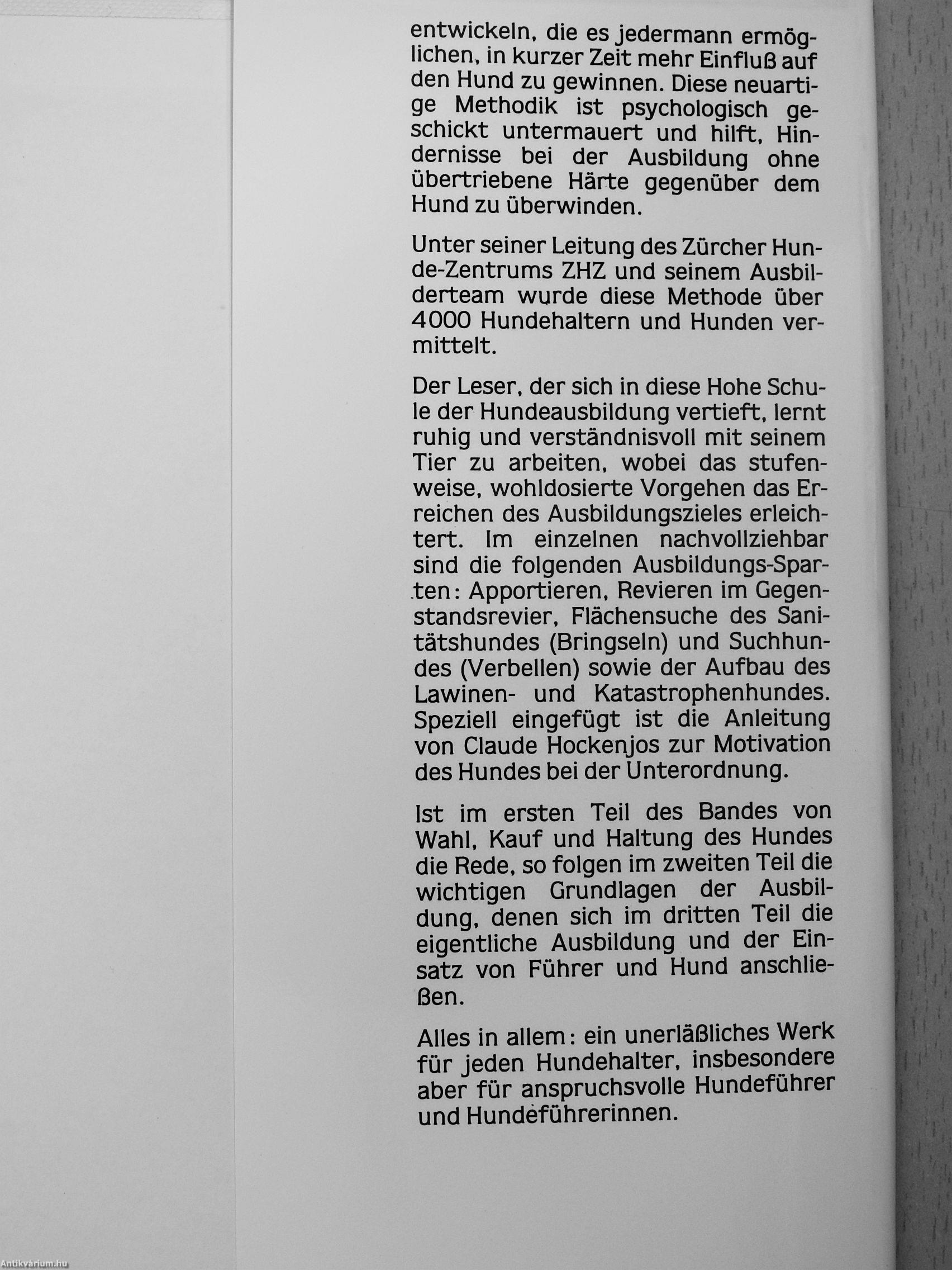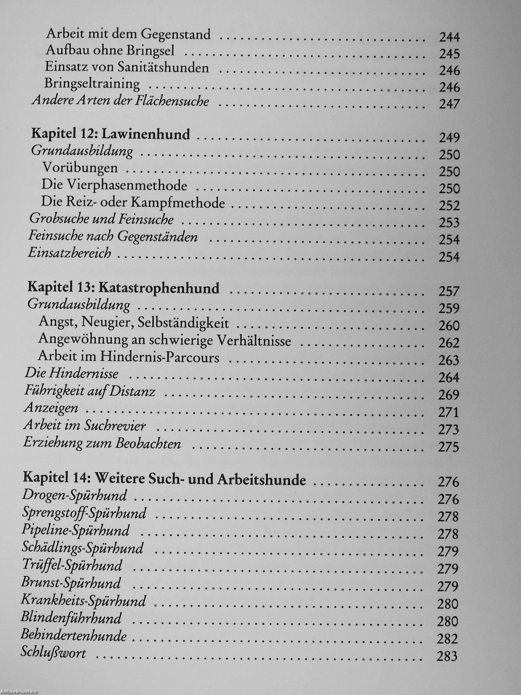 Der Leser, der sich in diese Hohe Schule der Hundeausbildung vertieft, lernt ruhig und verständnisvoll mit seinem Tier zu arbeiten, wobei das stufenweise. wohldosierte Vorgehen das Erreichen des Ausbildungszieles erleichtert. Im einzelnen nachvollziehbar sind die folgenden Ausbildungs-Spar-ten: Apportieren, Revieren im Gegen-standsrevier. Flächensuche des Sanitätshundes (Bringsein) und Suchhundes (Verbellen) sowie der Aufbau des Lawinen- und Katastrophenhundes. Speziell eingefügt ist die Anleitung von Claude Hockenjos zur Motivation des Hundes bei der Unterordnung.