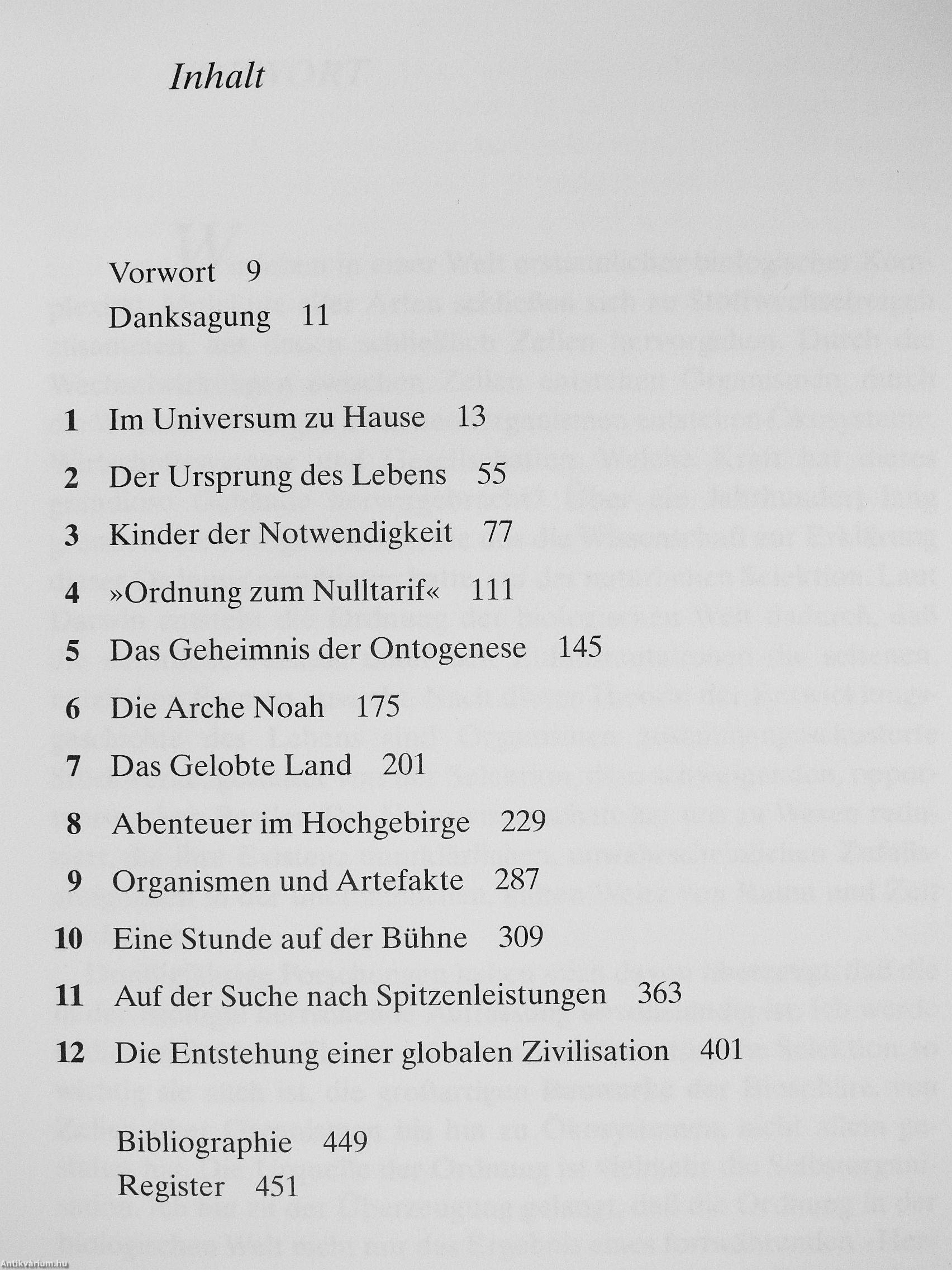 Im Universum zu Hause • Der Ursprung des Lebens • Kinder der Notwendigkeit • »Ordnung zum Nulltarif« • Das Geheimnis der Ontogenese • Die Arche Noah • Das Gelobte Land • Abenteuer im Hochgebirge • Organismen und Artefakte • Eine Stunde auf der Bühne • Auf der Suche nach Spitzenleistungen • Die Entstehung einer globalen Zivilisation