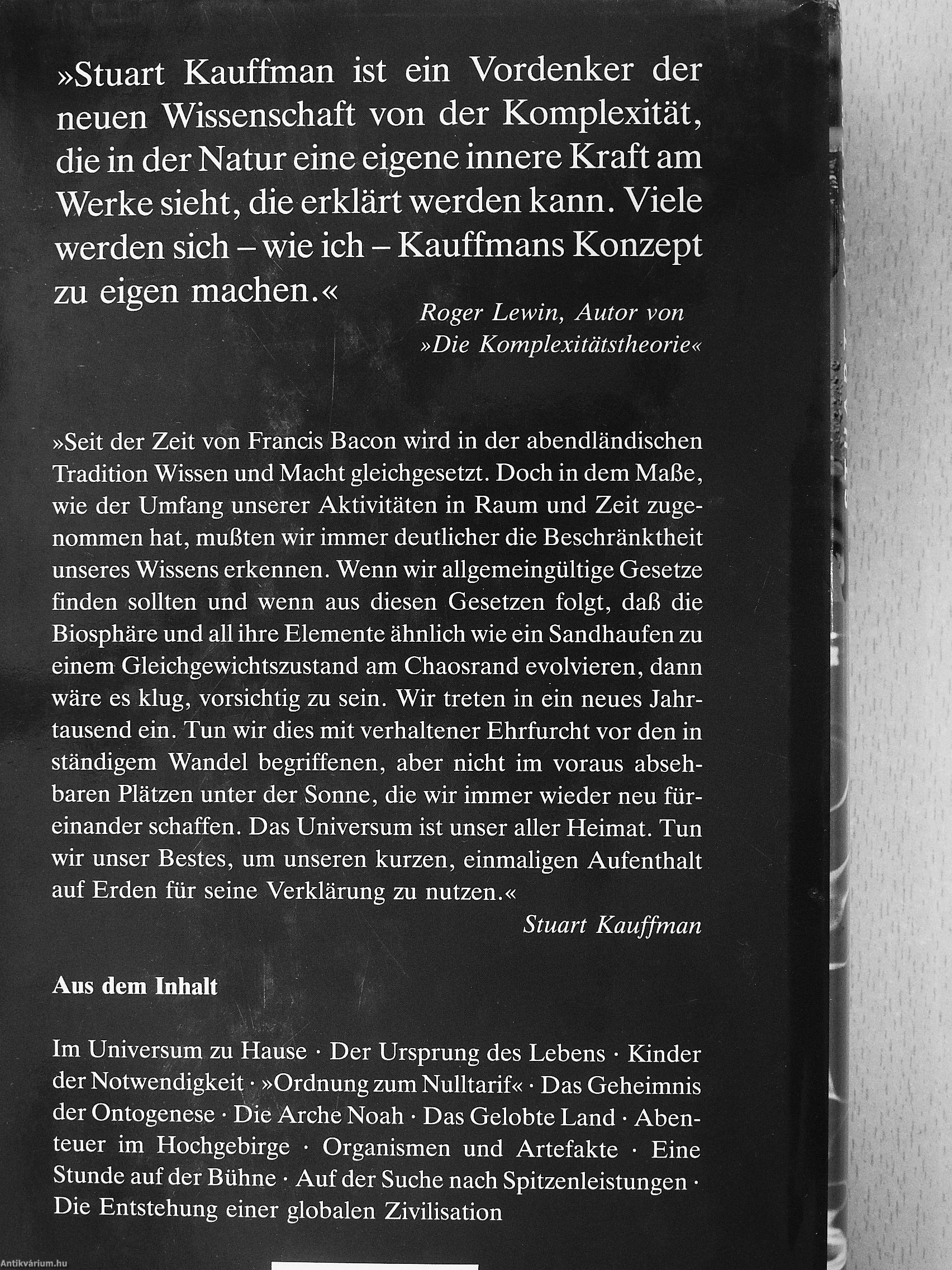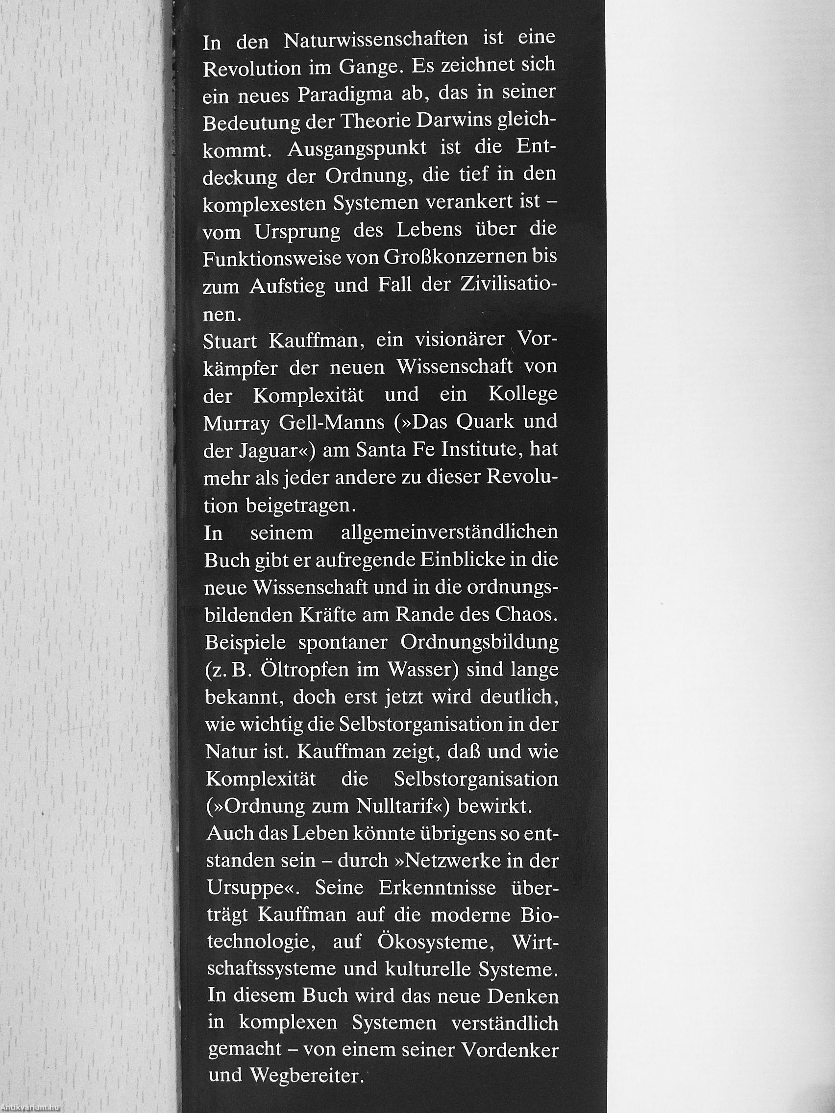 »Stuart Kauffman ist ein Vordenker der neuen Wissenschaft von der Komplexität, die in der Natur eine eigene innere Kraft am Werke sieht, die erklärt werden kann. Viele werden sich - wie ich - Kauffmans Konzept zu eigen machen.«